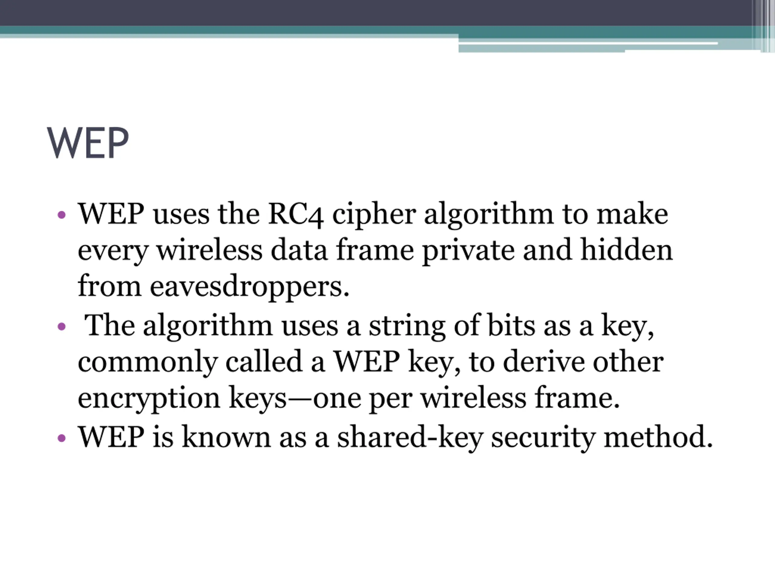 WEP WEP uses the RC4 cipher algorithm to make every wireless data frame private and hidden from eavesdroppers. The algorithm uses a string of bits as a key, commonly called a WEP key, to derive other encryption keys one per wireless frame. WEP is known as a shared-key security method.