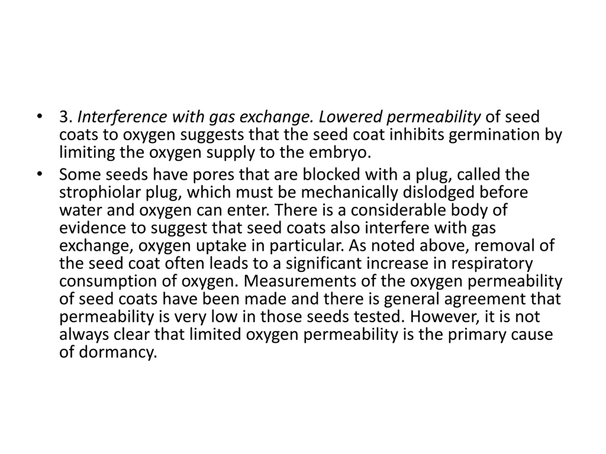 3. Interference with gas exchange. Lowered permeability of seed coats to oxygen suggests that the seed coat inhibits germination by limiting the oxygen supply to the embryo. Some seeds have pores that are blocked with a plug, called the strophiolar plug, which must be mechanically dislodged before water and oxygen can enter. There is a considerable body of evidence to suggest that seed coats also interfere with gas exchange, oxygen uptake in particular. As noted above, removal of the seed coat often leads to a significant increase in respiratory consumption of oxygen. Measurements of the oxygen permeability of seed coats have been made and there is general agreement that permeability is very low in those seeds tested. However, it is not always clear that limited oxygen permeability is the primary cause of dormancy.
