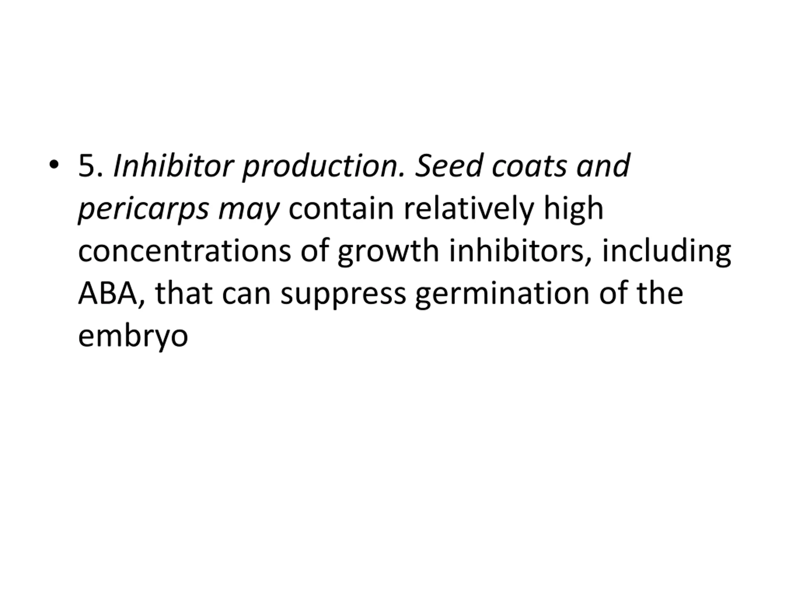 5. Inhibitor production. Seed coats and pericarps may contain relatively high concentrations of growth inhibitors, including ABA, that can suppress germination of the embryo