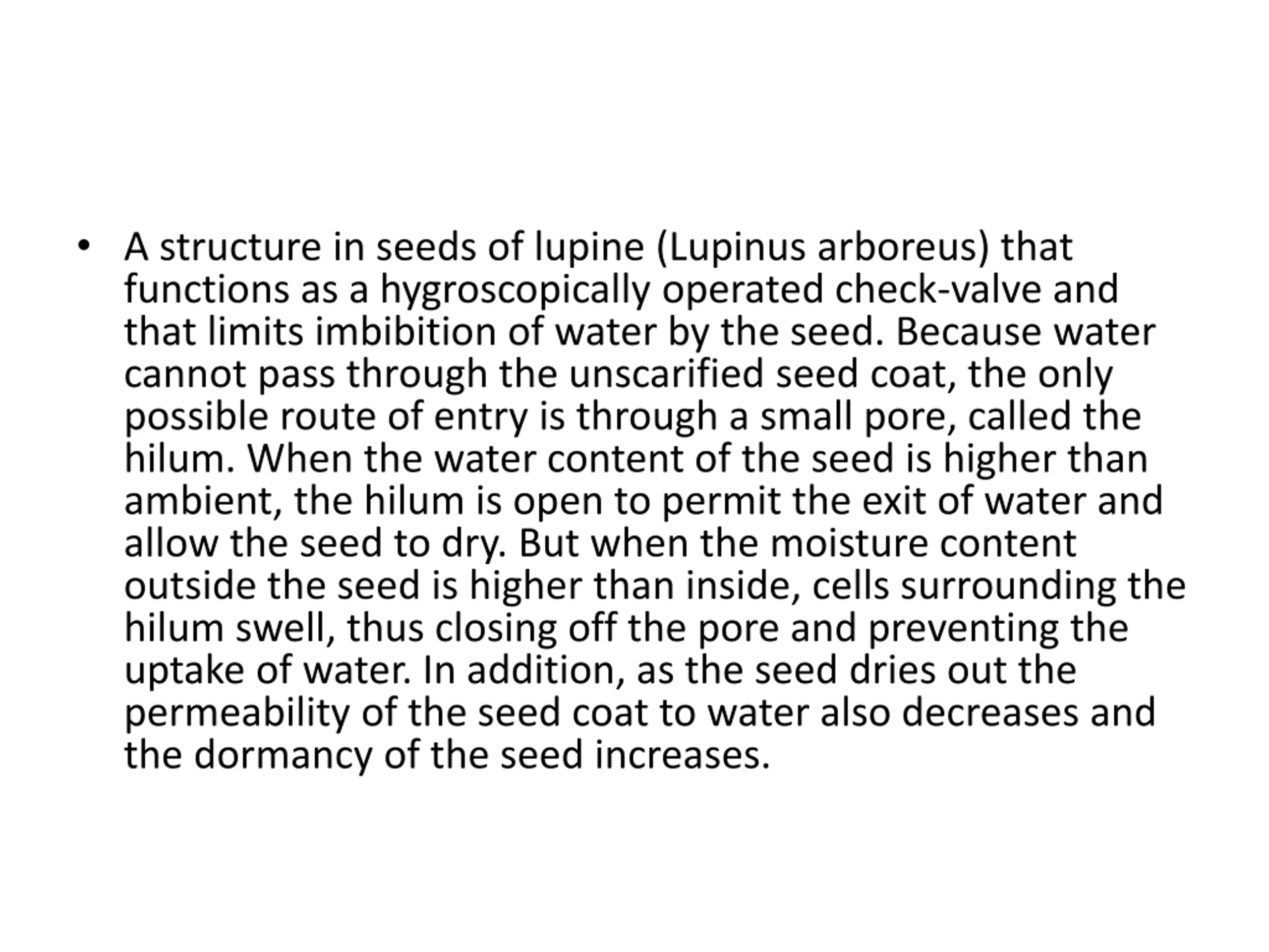 A structure in seeds of lupine (Lupinus arboreus) that functions as a hygroscopically operated check-valve and that limits imbibition of water by the seed. Because water cannot pass through the unscarified seed coat, the only possible route of entry is through a small pore, called the hilum. When the water content of the seed is higher than ambient, the hilum is open to permit the exit of water and allow the seed to dry. But when the moisture content outside the seed is higher than inside, cells surrounding the hilum swell, thus closing off the pore and preventing the uptake of water. In addition, as the seed dries out the permeability of the seed coat to water also decreases and the dormancy of the seed increases.