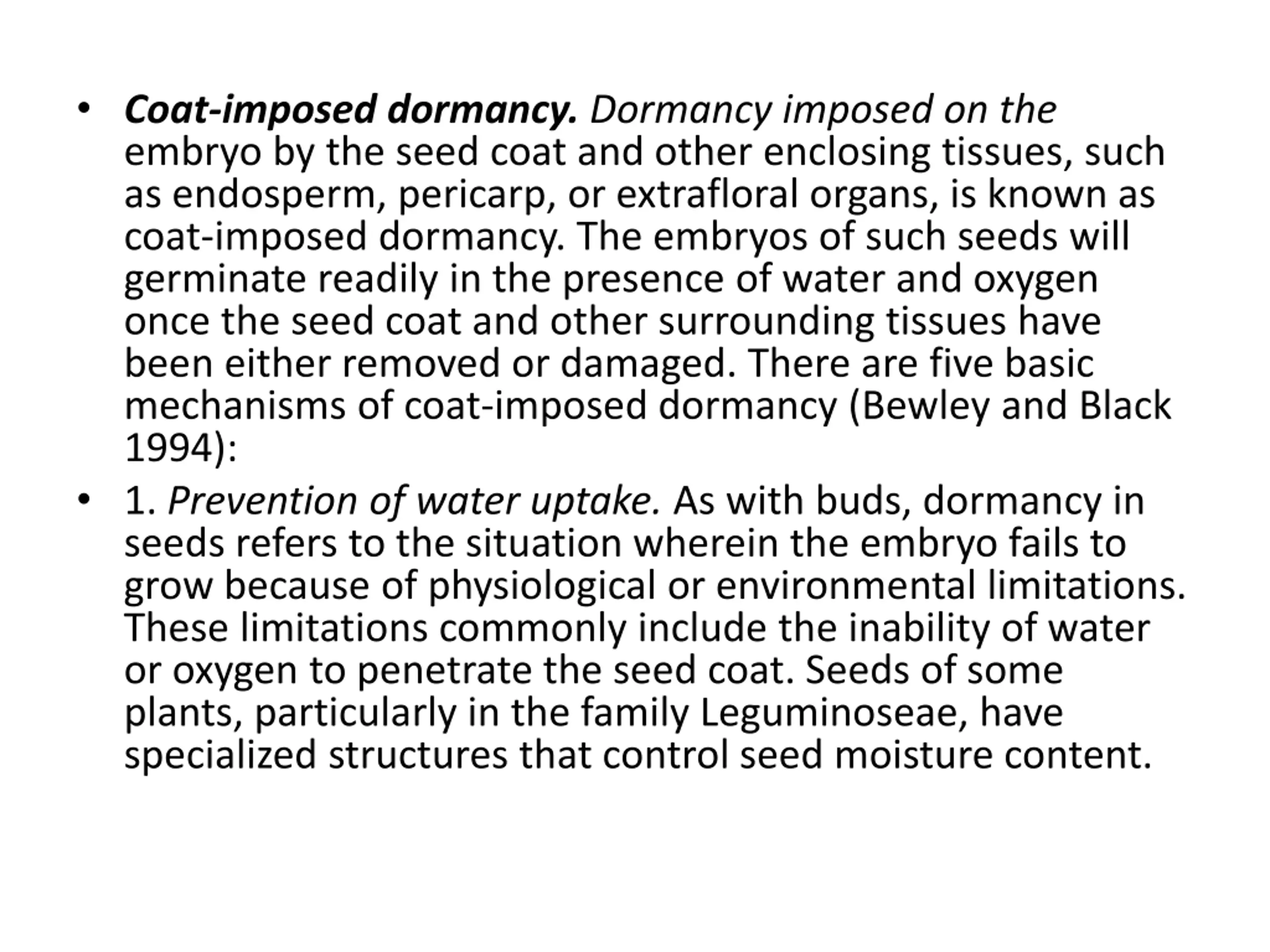 Coat-imposed dormancy. Dormancy imposed on the embryo by the seed coat and other enclosing tissues, such as endosperm, pericarp, or extrafloral organs, is known as coat-imposed dormancy. The embryos of such seeds will germinate readily in the presence of water and oxygen once the seed coat and other surrounding tissues have been either removed or damaged. There are five basic mechanisms of coat-imposed dormancy (Bewley and Black 1994): 1. Prevention of water uptake. As with buds, dormancy in seeds refers to the situation wherein the embryo fails to grow because of physiological or environmental limitations. These limitations commonly include the inability of water or oxygen to penetrate the seed coat. Seeds of some plants, particularly in the family Leguminoseae, have specialized structures that control seed moisture content.