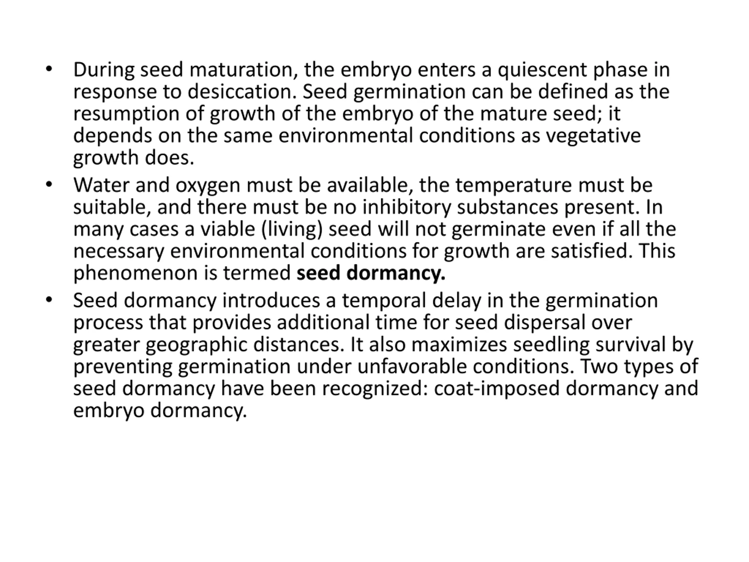 During seed maturation, the embryo enters a quiescent phase in response to desiccation. Seed germination can be defined as the resumption of growth of the embryo of the mature seed; it depends on the same environmental conditions as vegetative growth does. Water and oxygen must be available, the temperature must be suitable, and there must be no inhibitory substances present. In many cases a viable (living) seed will not germinate even if all the necessary environmental conditions for growth are satisfied. This phenomenon is termed seed dormancy. Seed dormancy introduces a temporal delay in the germination process that provides additional time for seed dispersal over greater geographic distances. It also maximizes seedling survival by preventing germination under unfavorable conditions. Two types of seed dormancy have been recognized: coat-imposed dormancy and embryo dormancy.