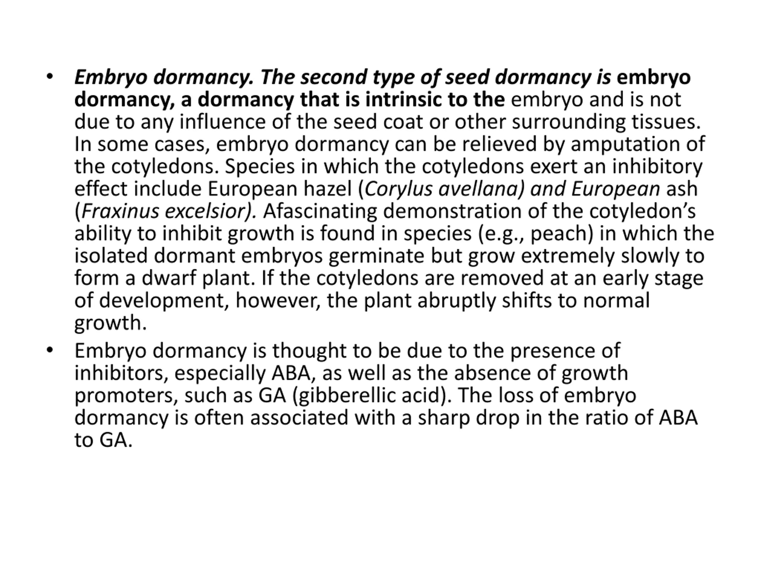 Embryo dormancy. The second type of seed dormancy is embryo dormancy, a dormancy that is intrinsic to the embryo and is not due to any influence of the seed coat or other surrounding tissues. In some cases, embryo dormancy can be relieved by amputation of the cotyledons. Species in which the cotyledons exert an inhibitory effect include European hazel (Corylus avellana) and European ash (Fraxinus excelsior). Afascinating demonstration of the cotyledon s ability to inhibit growth is found in species (e.g., peach) in which the isolated dormant embryos germinate but grow extremely slowly to form a dwarf plant. If the cotyledons are removed at an early stage of development, however, the plant abruptly shifts to normal growth. Embryo dormancy is thought to be due to the presence of inhibitors, especially ABA, as well as the absence of growth promoters, such as GA (gibberellic acid). The loss of embryo dormancy is often associated with a sharp drop in the ratio of ABA to GA.