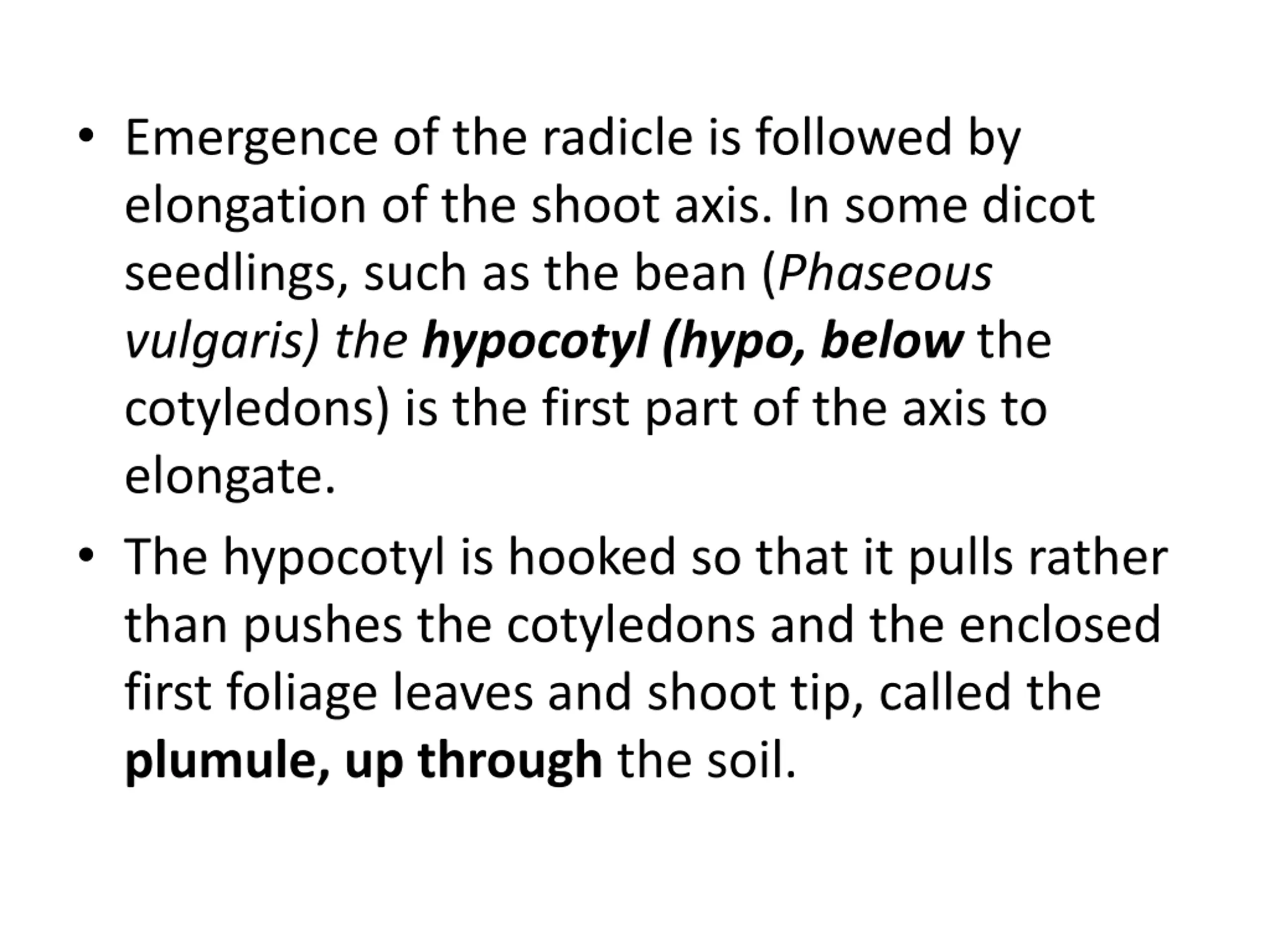 Emergence of the radicle is followed by elongation of the shoot axis. In some dicot seedlings, such as the bean (Phaseous vulgaris) the hypocotyl (hypo, below the cotyledons) is the first part of the axis to elongate. The hypocotyl is hooked so that it pulls rather than pushes the cotyledons and the enclosed first foliage leaves and shoot tip, called the plumule, up through the soil.