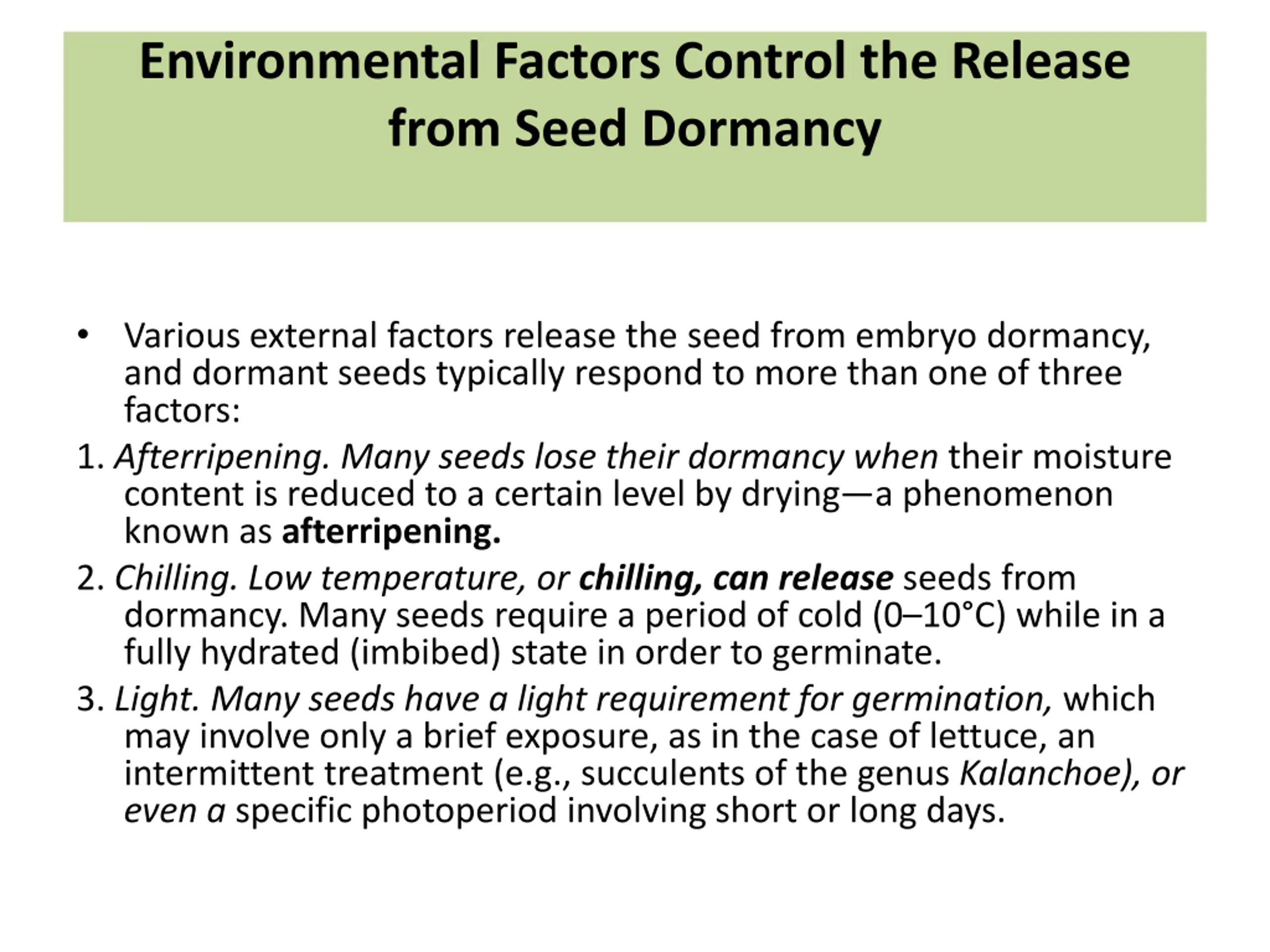 Environmental Factors Control the Release from Seed Dormancy Various external factors release the seed from embryo dormancy, and dormant seeds typically respond to more than one of three factors: 1. Afterripening. Many seeds lose their dormancy when their moisture content is reduced to a certain level by drying a phenomenon known as afterripening. 2. Chilling. Low temperature, or chilling, can release seeds from dormancy. Many seeds require a period of cold (0 10 C) while in a fully hydrated (imbibed) state in order to germinate. 3. Light. Many seeds have a light requirement for germination, which may involve only a brief exposure, as in the case of lettuce, an intermittent treatment (e.g., succulents of the genus Kalanchoe), or even a specific photoperiod involving short or long days.