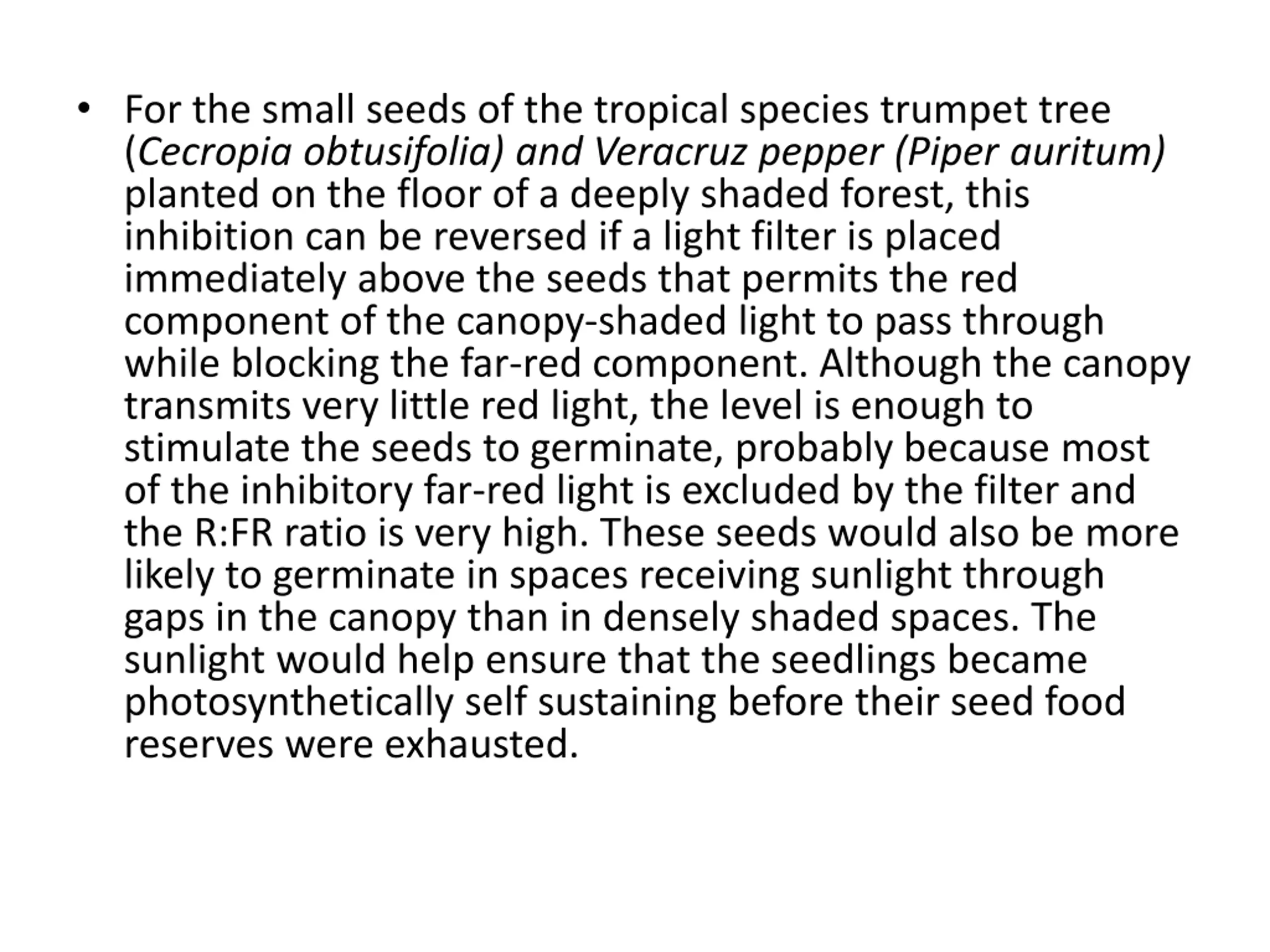 For the small seeds of the tropical species trumpet tree (Cecropia obtusifolia) and Veracruz pepper (Piper auritum) planted on the floor of a deeply shaded forest, this inhibition can be reversed if a light filter is placed immediately above the seeds that permits the red component of the canopy-shaded light to pass through while blocking the far-red component. Although the canopy transmits very little red light, the level is enough to stimulate the seeds to germinate, probably because most of the inhibitory far-red light is excluded by the filter and the R:FR ratio is very high. These seeds would also be more likely to germinate in spaces receiving sunlight through gaps in the canopy than in densely shaded spaces. The sunlight would help ensure that the seedlings became photosynthetically self sustaining before their seed food reserves were exhausted.