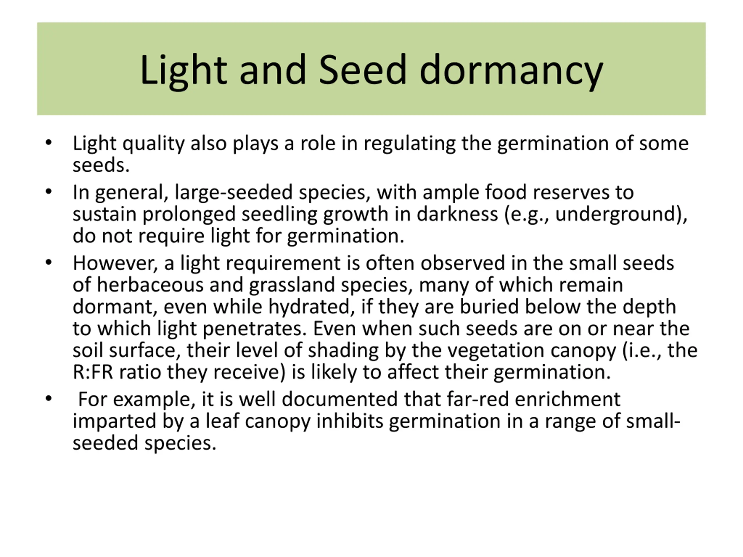 Light and Seed dormancy Light quality also plays a role in regulating the germination of some seeds. In general, large-seeded species, with ample food reserves to sustain prolonged seedling growth in darkness (e.g., underground), do not require light for germination. However, a light requirement is often observed in the small seeds of herbaceous and grassland species, many of which remain dormant, even while hydrated, if they are buried below the depth to which light penetrates. Even when such seeds are on or near the soil surface, their level of shading by the vegetation canopy (i.e., the R:FR ratio they receive) is likely to affect their germination. For example, it is well documented that far-red enrichment imparted by a leaf canopy inhibits germination in a range of small- seeded species.