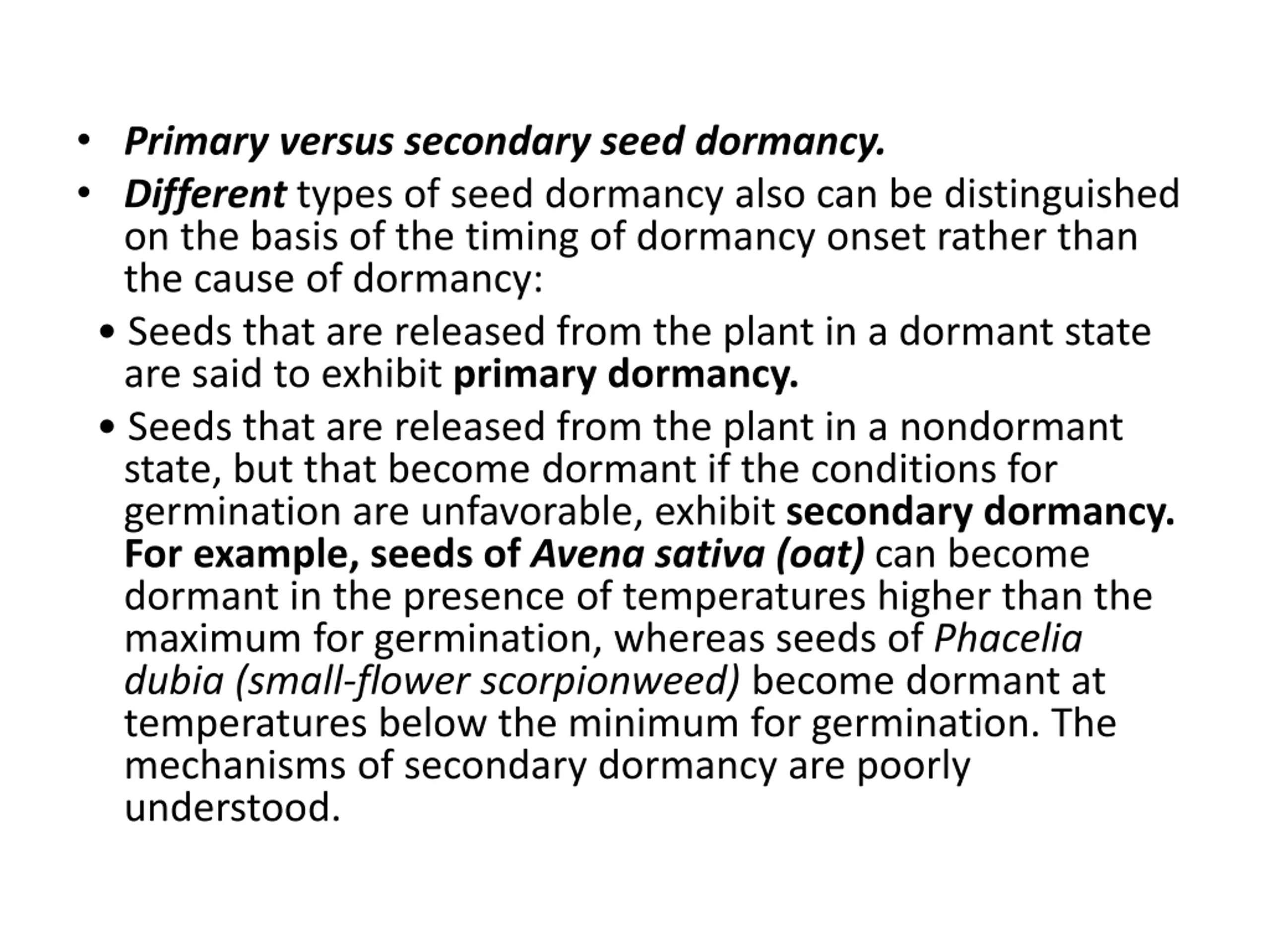 Primary versus secondary seed dormancy. Different types of seed dormancy also can be distinguished on the basis of the timing of dormancy onset rather than the cause of dormancy: Seeds that are released from the plant in a dormant state are said to exhibit primary dormancy. Seeds that are released from the plant in a nondormant state, but that become dormant if the conditions for germination are unfavorable, exhibit secondary dormancy. For example, seeds of Avena sativa (oat) can become dormant in the presence of temperatures higher than the maximum for germination, whereas seeds of Phacelia dubia (small-flower scorpionweed) become dormant at temperatures below the minimum for germination. The mechanisms of secondary dormancy are poorly understood.