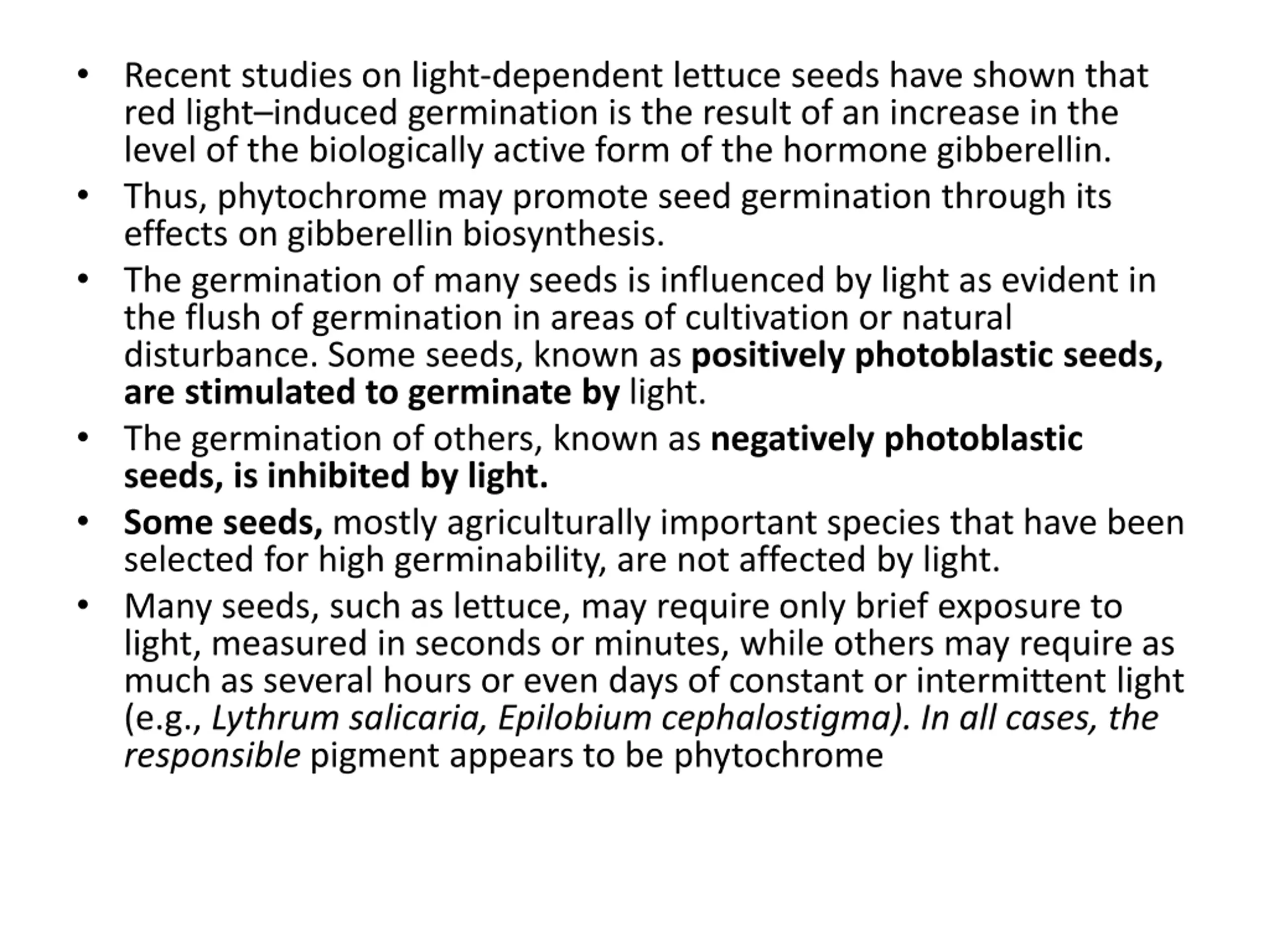 Recent studies on light-dependent lettuce seeds have shown that red light induced germination is the result of an increase in the level of the biologically active form of the hormone gibberellin. Thus, phytochrome may promote seed germination through its effects on gibberellin biosynthesis. The germination of many seeds is influenced by light as evident in the flush of germination in areas of cultivation or natural disturbance. Some seeds, known as positively photoblastic seeds, are stimulated to germinate by light. The germination of others, known as negatively photoblastic seeds, is inhibited by light. Some seeds, mostly agriculturally important species that have been selected for high germinability, are not affected by light. Many seeds, such as lettuce, may require only brief exposure to light, measured in seconds or minutes, while others may require as much as several hours or even days of constant or intermittent light (e.g., Lythrum salicaria, Epilobium cephalostigma). In all cases, the responsible pigment appears to be phytochrome