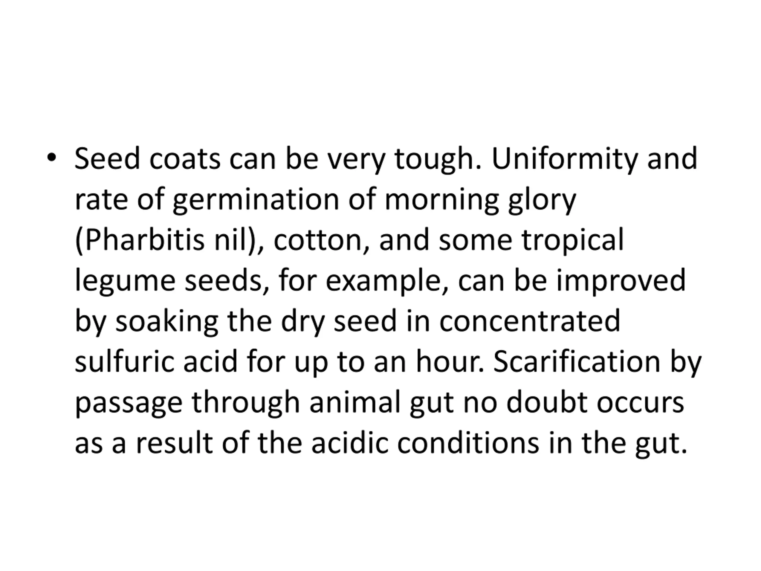 Seed coats can be very tough. Uniformity and rate of germination of morning glory (Pharbitis nil), cotton, and some tropical legume seeds, for example, can be improved by soaking the dry seed in concentrated sulfuric acid for up to an hour. Scarification by passage through animal gut no doubt occurs as a result of the acidic conditions in the gut.
