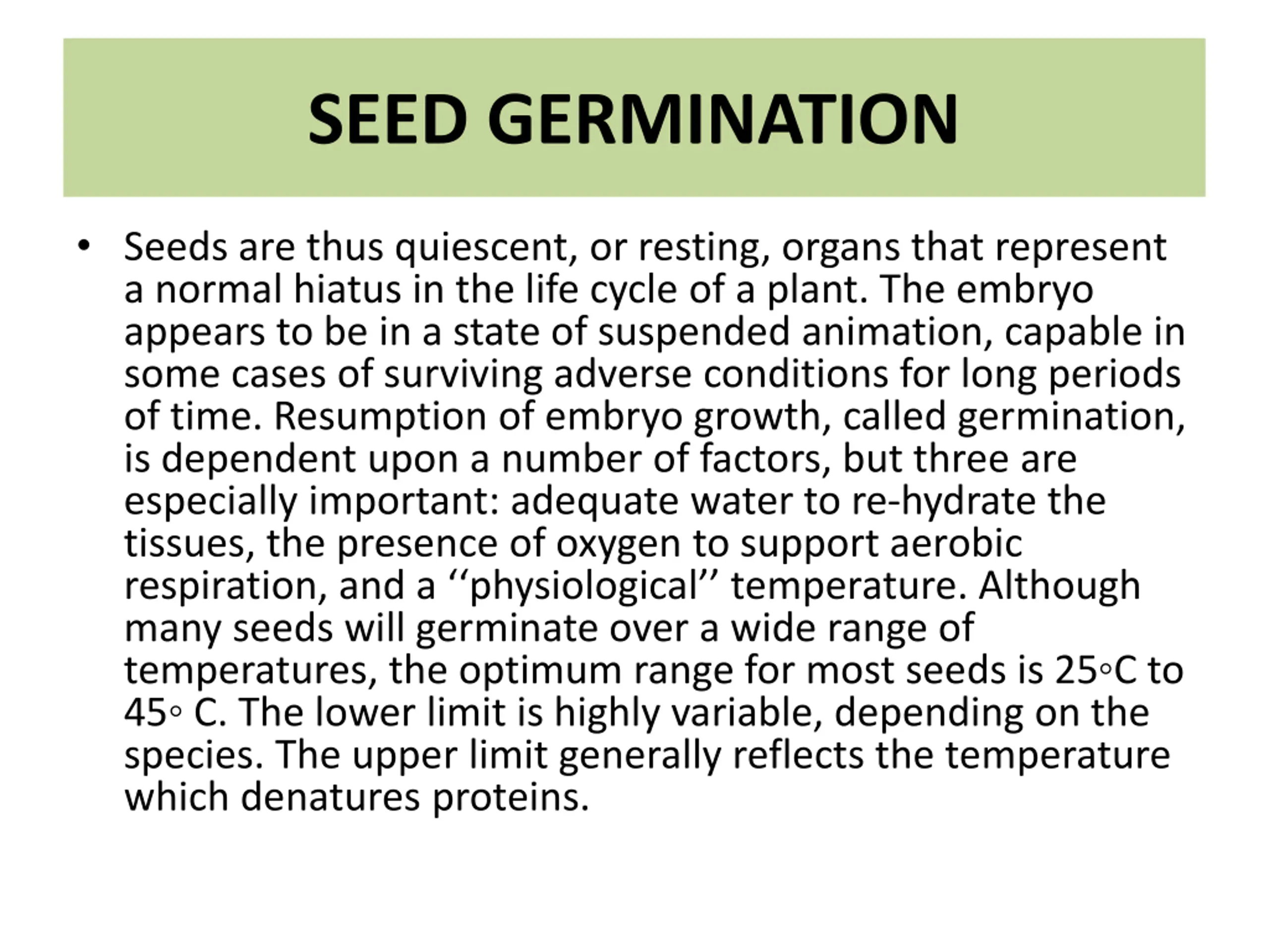 SEED GERMINATION Seeds are thus quiescent, or resting, organs that represent a normal hiatus in the life cycle of a plant. The embryo appears to be in a state of suspended animation, capable in some cases of surviving adverse conditions for long periods of time. Resumption of embryo growth, called germination, is dependent upon a number of factors, but three are especially important: adequate water to re-hydrate the tissues, the presence of oxygen to support aerobic respiration, and a physiological temperature. Although many seeds will germinate over a wide range of temperatures, the optimum range for most seeds is 25 C to 45 C. The lower limit is highly variable, depending on the species. The upper limit generally reflects the temperature which denatures proteins.
