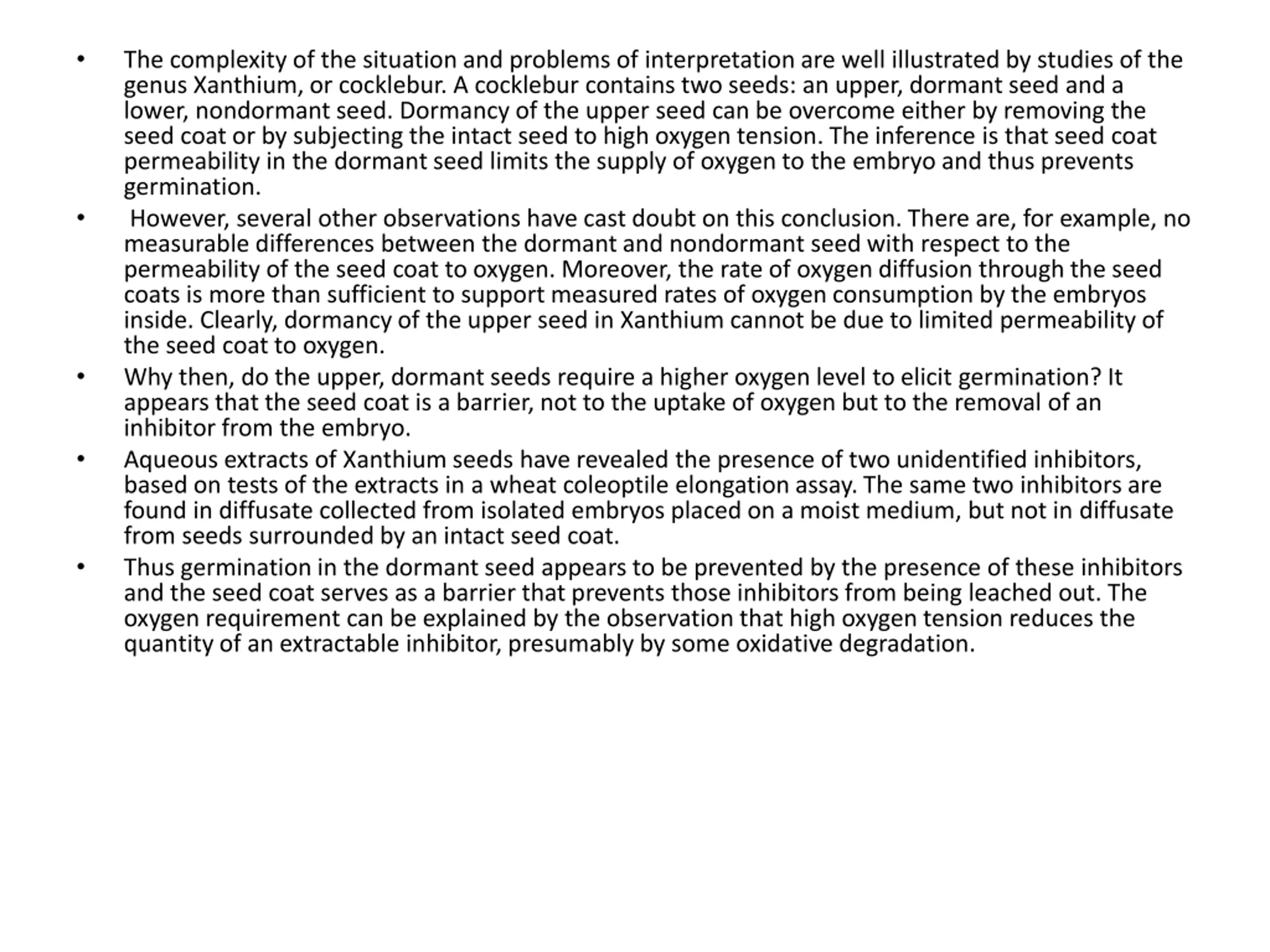 The complexity of the situation and problems of interpretation are well illustrated by studies of the genus Xanthium, or cocklebur. A cocklebur contains two seeds: an upper, dormant seed and a lower, nondormant seed. Dormancy of the upper seed can be overcome either by removing the seed coat or by subjecting the intact seed to high oxygen tension. The inference is that seed coat permeability in the dormant seed limits the supply of oxygen to the embryo and thus prevents germination. However, several other observations have cast doubt on this conclusion. There are, for example, no measurable differences between the dormant and nondormant seed with respect to the permeability of the seed coat to oxygen. Moreover, the rate of oxygen diffusion through the seed coats is more than sufficient to support measured rates of oxygen consumption by the embryos inside. Clearly, dormancy of the upper seed in Xanthium cannot be due to limited permeability of the seed coat to oxygen. Why then, do the upper, dormant seeds require a higher oxygen level to elicit germination? It appears that the seed coat is a barrier, not to the uptake of oxygen but to the removal of an inhibitor from the embryo. Aqueous extracts of Xanthium seeds have revealed the presence of two unidentified inhibitors, based on tests of the extracts in a wheat coleoptile elongation assay. The same two inhibitors are found in diffusate collected from isolated embryos placed on a moist medium, but not in diffusate from seeds surrounded by an intact seed coat. Thus germination in the dormant seed appears to be prevented by the presence of these inhibitors and the seed coat serves as a barrier that prevents those inhibitors from being leached out. The oxygen requirement can be explained by the observation that high oxygen tension reduces the quantity of an extractable inhibitor, presumably by some oxidative degradation.