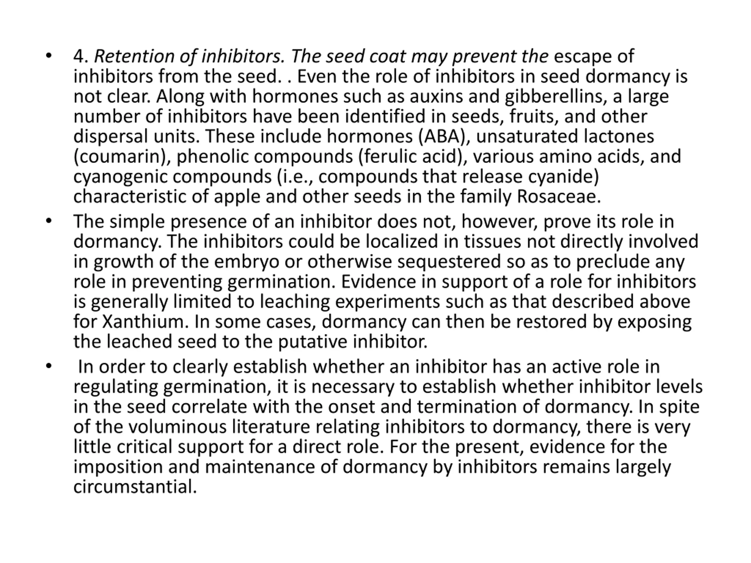 4. Retention of inhibitors. The seed coat may prevent the escape of inhibitors from the seed. . Even the role of inhibitors in seed dormancy is not clear. Along with hormones such as auxins and gibberellins, a large number of inhibitors have been identified in seeds, fruits, and other dispersal units. These include hormones (ABA), unsaturated lactones (coumarin), phenolic compounds (ferulic acid), various amino acids, and cyanogenic compounds (i.e., compounds that release cyanide) characteristic of apple and other seeds in the family Rosaceae. The simple presence of an inhibitor does not, however, prove its role in dormancy. The inhibitors could be localized in tissues not directly involved in growth of the embryo or otherwise sequestered so as to preclude any role in preventing germination. Evidence in support of a role for inhibitors is generally limited to leaching experiments such as that described above for Xanthium. In some cases, dormancy can then be restored by exposing the leached seed to the putative inhibitor. In order to clearly establish whether an inhibitor has an active role in regulating germination, it is necessary to establish whether inhibitor levels in the seed correlate with the onset and termination of dormancy. In spite of the voluminous literature relating inhibitors to dormancy, there is very little critical support for a direct role. For the present, evidence for the imposition and maintenance of dormancy by inhibitors remains largely circumstantial.