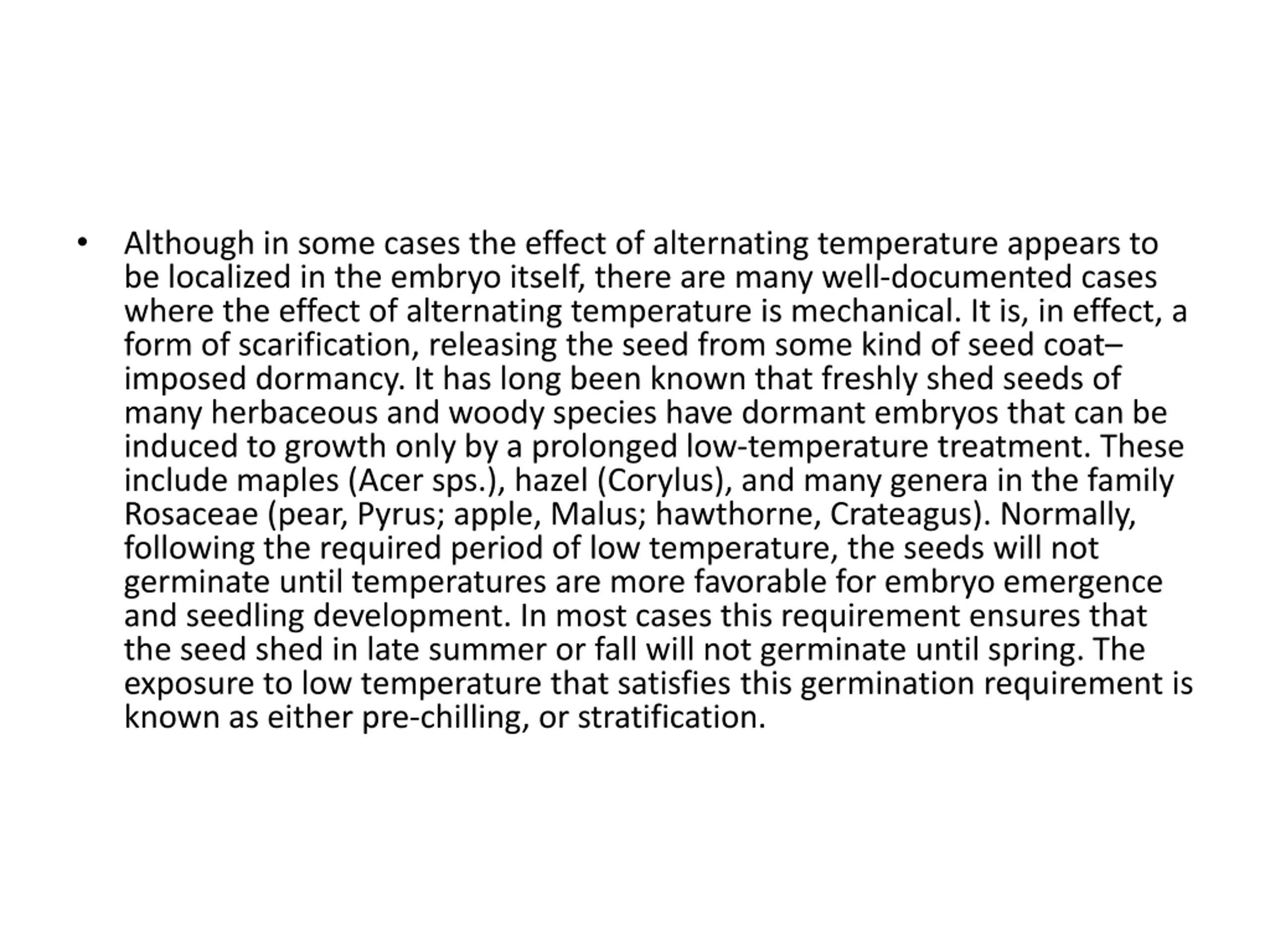Although in some cases the effect of alternating temperature appears to be localized in the embryo itself, there are many well-documented cases where the effect of alternating temperature is mechanical. It is, in effect, a form of scarification, releasing the seed from some kind of seed coat imposed dormancy. It has long been known that freshly shed seeds of many herbaceous and woody species have dormant embryos that can be induced to growth only by a prolonged low-temperature treatment. These include maples (Acer sps.), hazel (Corylus), and many genera in the family Rosaceae (pear, Pyrus; apple, Malus; hawthorne, Crateagus). Normally, following the required period of low temperature, the seeds will not germinate until temperatures are more favorable for embryo emergence and seedling development. In most cases this requirement ensures that the seed shed in late summer or fall will not germinate until spring. The exposure to low temperature that satisfies this germination requirement is known as either pre-chilling, or stratification.