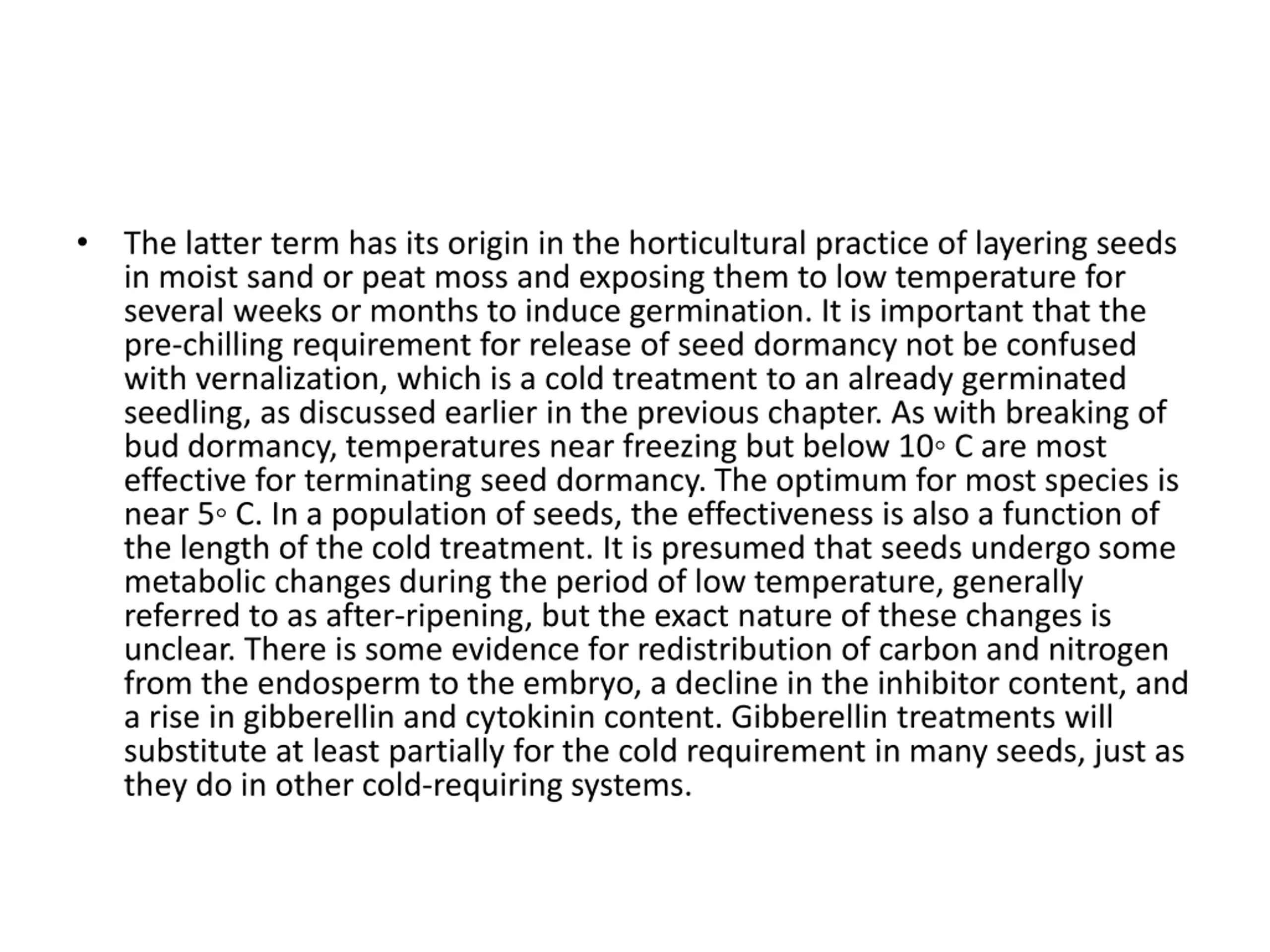 The latter term has its origin in the horticultural practice of layering seeds in moist sand or peat moss and exposing them to low temperature for several weeks or months to induce germination. It is important that the pre-chilling requirement for release of seed dormancy not be confused with vernalization, which is a cold treatment to an already germinated seedling, as discussed earlier in the previous chapter. As with breaking of bud dormancy, temperatures near freezing but below 10 C are most effective for terminating seed dormancy. The optimum for most species is near 5 C. In a population of seeds, the effectiveness is also a function of the length of the cold treatment. It is presumed that seeds undergo some metabolic changes during the period of low temperature, generally referred to as after-ripening, but the exact nature of these changes is unclear. There is some evidence for redistribution of carbon and nitrogen from the endosperm to the embryo, a decline in the inhibitor content, and a rise in gibberellin and cytokinin content. Gibberellin treatments will substitute at least partially for the cold requirement in many seeds, just as they do in other cold-requiring systems.