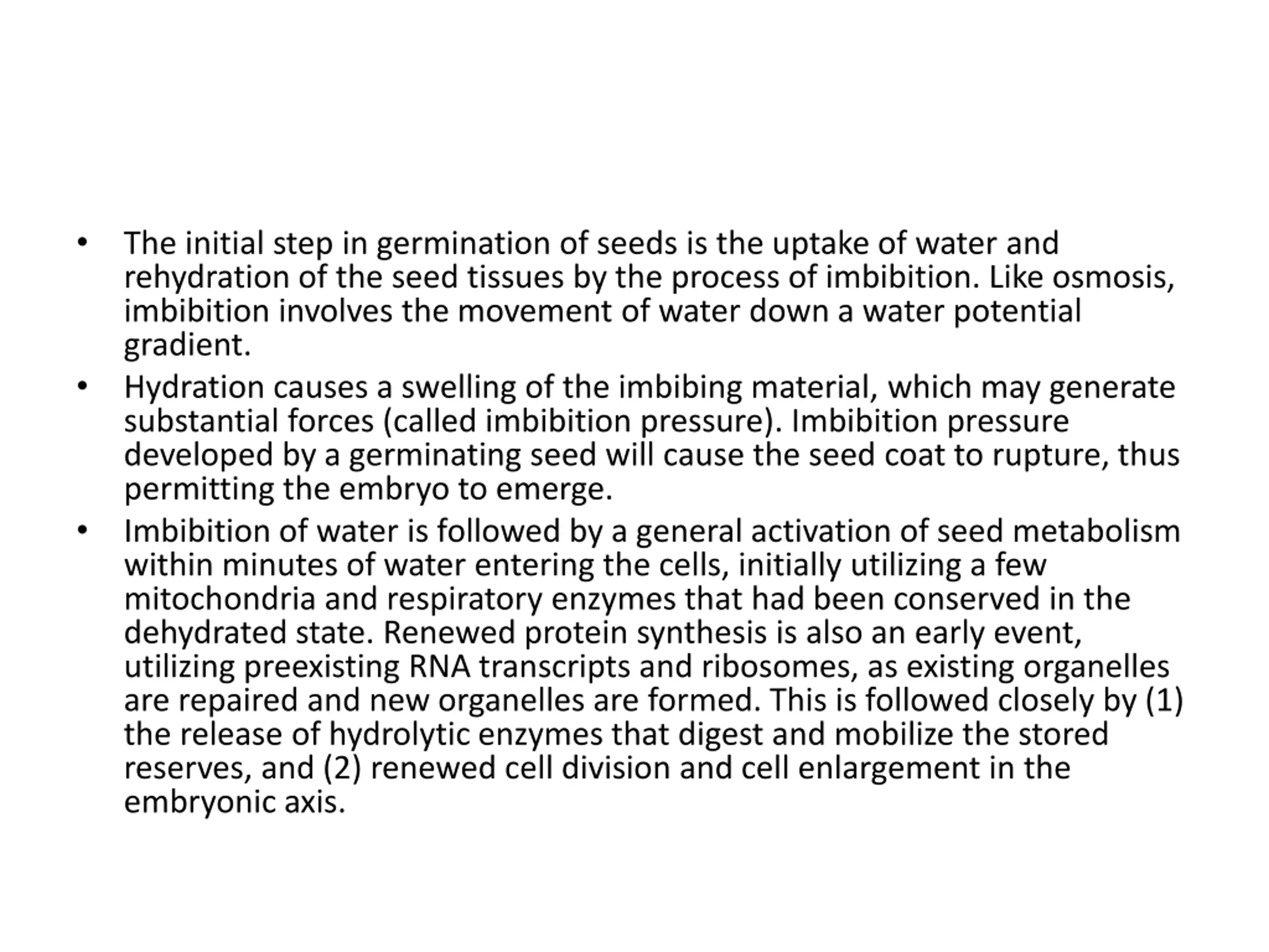 The initial step in germination of seeds is the uptake of water and rehydration of the seed tissues by the process of imbibition. Like osmosis, imbibition involves the movement of water down a water potential gradient. Hydration causes a swelling of the imbibing material, which may generate substantial forces (called imbibition pressure). Imbibition pressure developed by a germinating seed will cause the seed coat to rupture, thus permitting the embryo to emerge. Imbibition of water is followed by a general activation of seed metabolism within minutes of water entering the cells, initially utilizing a few mitochondria and respiratory enzymes that had been conserved in the dehydrated state. Renewed protein synthesis is also an early event, utilizing preexisting RNA transcripts and ribosomes, as existing organelles are repaired and new organelles are formed. This is followed closely by (1) the release of hydrolytic enzymes that digest and mobilize the stored reserves, and (2) renewed cell division and cell enlargement in the embryonic axis.