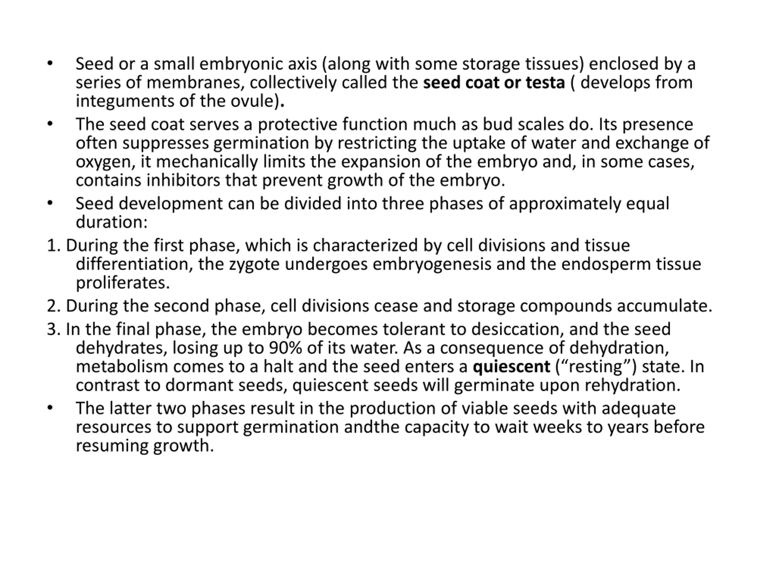 Seed or a small embryonic axis (along with some storage tissues) enclosed by a series of membranes, collectively called the seed coat or testa ( develops from integuments of the ovule). The seed coat serves a protective function much as bud scales do. Its presence often suppresses germination by restricting the uptake of water and exchange of oxygen, it mechanically limits the expansion of the embryo and, in some cases, contains inhibitors that prevent growth of the embryo. Seed development can be divided into three phases of approximately equal duration: 1. During the first phase, which is characterized by cell divisions and tissue differentiation, the zygote undergoes embryogenesis and the endosperm tissue proliferates. 2. During the second phase, cell divisions cease and storage compounds accumulate. 3. In the final phase, the embryo becomes tolerant to desiccation, and the seed dehydrates, losing up to 90% of its water. As a consequence of dehydration, metabolism comes to a halt and the seed enters a quiescent ( resting ) state. In contrast to dormant seeds, quiescent seeds will germinate upon rehydration. The latter two phases result in the production of viable seeds with adequate resources to support germination andthe capacity to wait weeks to years before resuming growth.