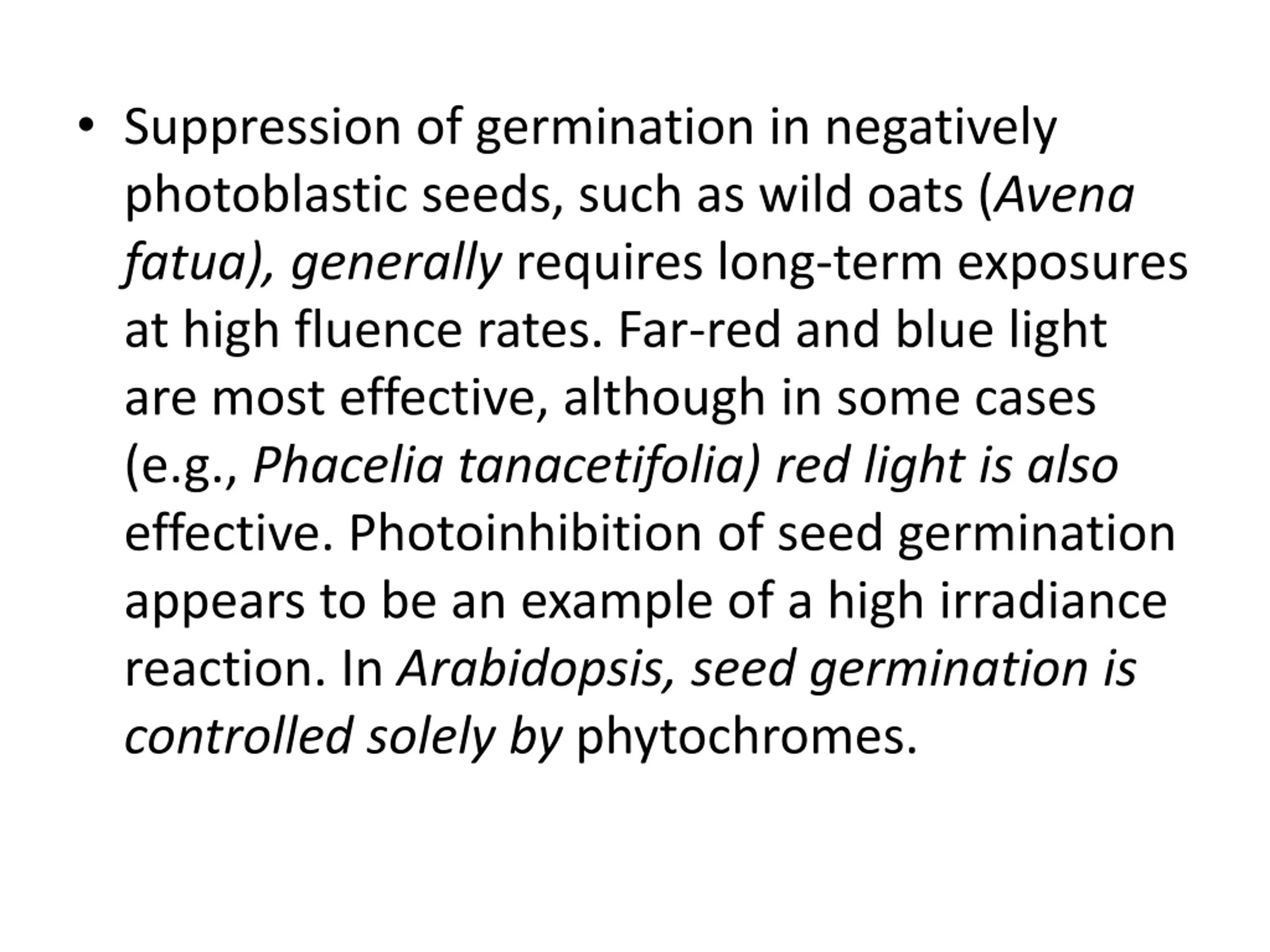 Suppression of germination in negatively photoblastic seeds, such as wild oats (Avena fatua), generally requires long-term exposures at high fluence rates. Far-red and blue light are most effective, although in some cases (e.g., Phacelia tanacetifolia) red light is also effective. Photoinhibition of seed germination appears to be an example of a high irradiance reaction. In Arabidopsis, seed germination is controlled solely by phytochromes.