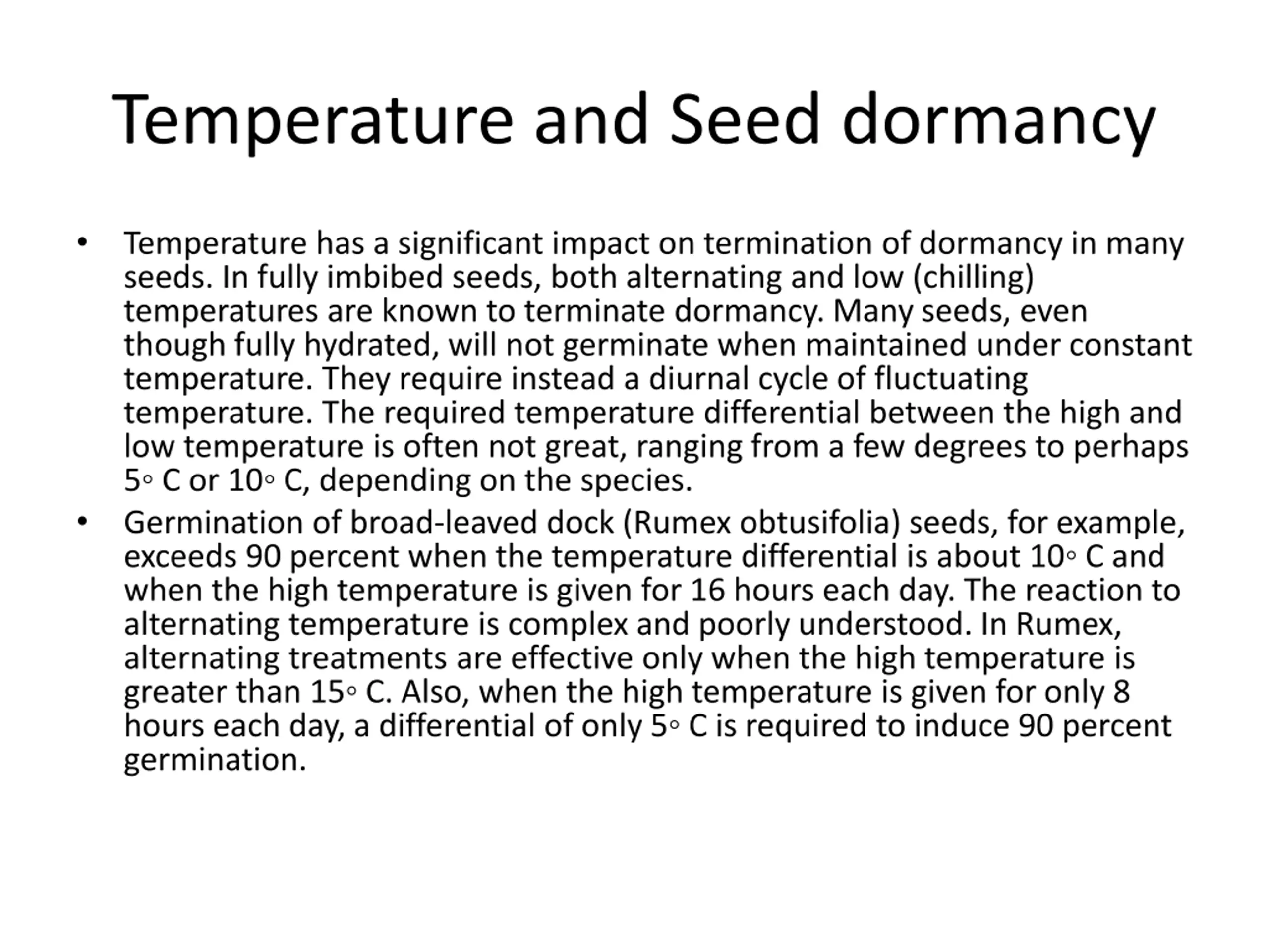 Temperature and Seed dormancy Temperature has a significant impact on termination of dormancy in many seeds. In fully imbibed seeds, both alternating and low (chilling) temperatures are known to terminate dormancy. Many seeds, even though fully hydrated, will not germinate when maintained under constant temperature. They require instead a diurnal cycle of fluctuating temperature. The required temperature differential between the high and low temperature is often not great, ranging from a few degrees to perhaps 5 C or 10 C, depending on the species. Germination of broad-leaved dock (Rumex obtusifolia) seeds, for example, exceeds 90 percent when the temperature differential is about 10 C and when the high temperature is given for 16 hours each day. The reaction to alternating temperature is complex and poorly understood. In Rumex, alternating treatments are effective only when the high temperature is greater than 15 C. Also, when the high temperature is given for only 8 hours each day, a differential of only 5 C is required to induce 90 percent germination.