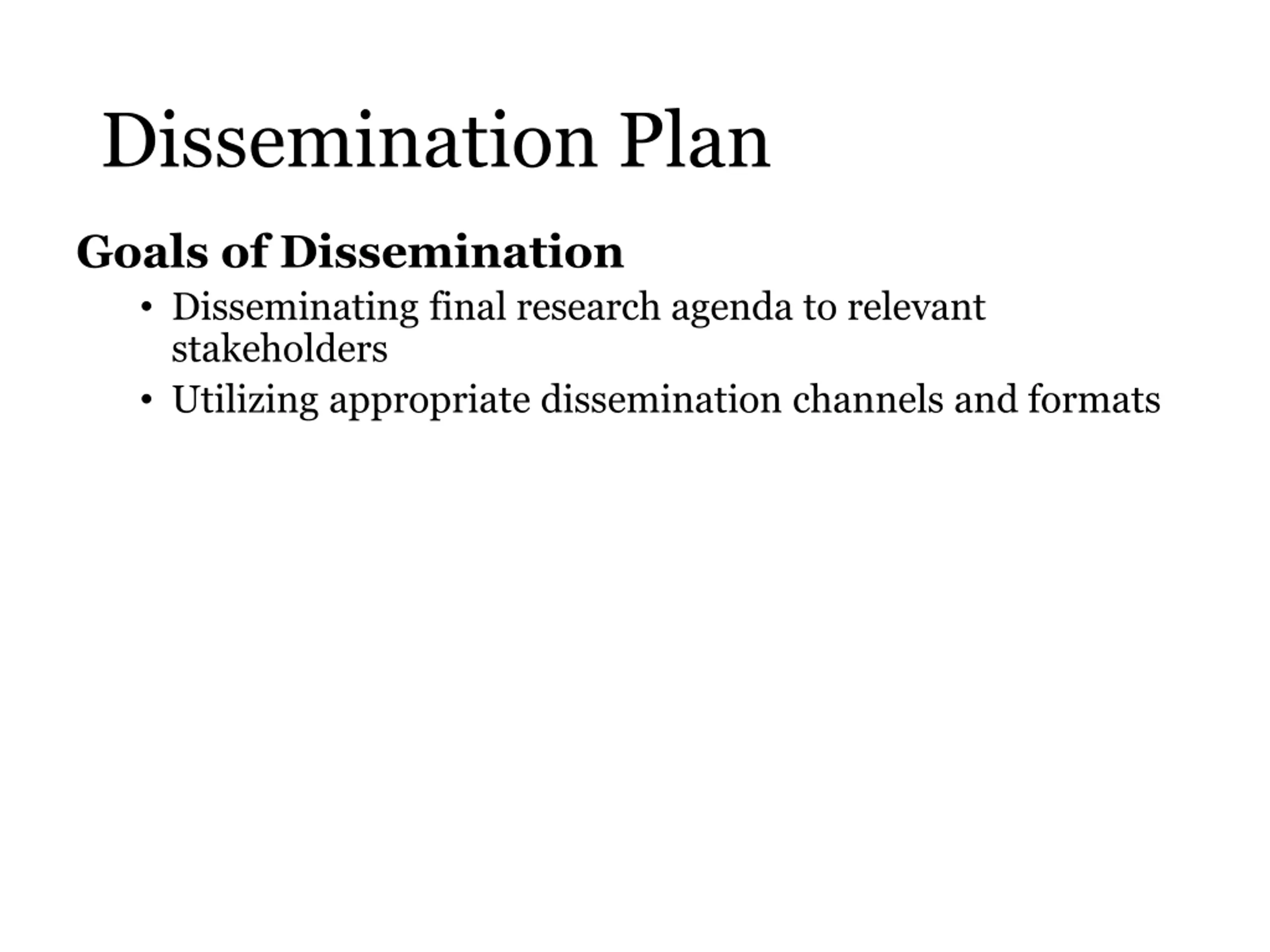 Dissemination Plan Goals of Dissemination Disseminating final research agenda to relevant stakeholders Utilizing appropriate dissemination channels and formats