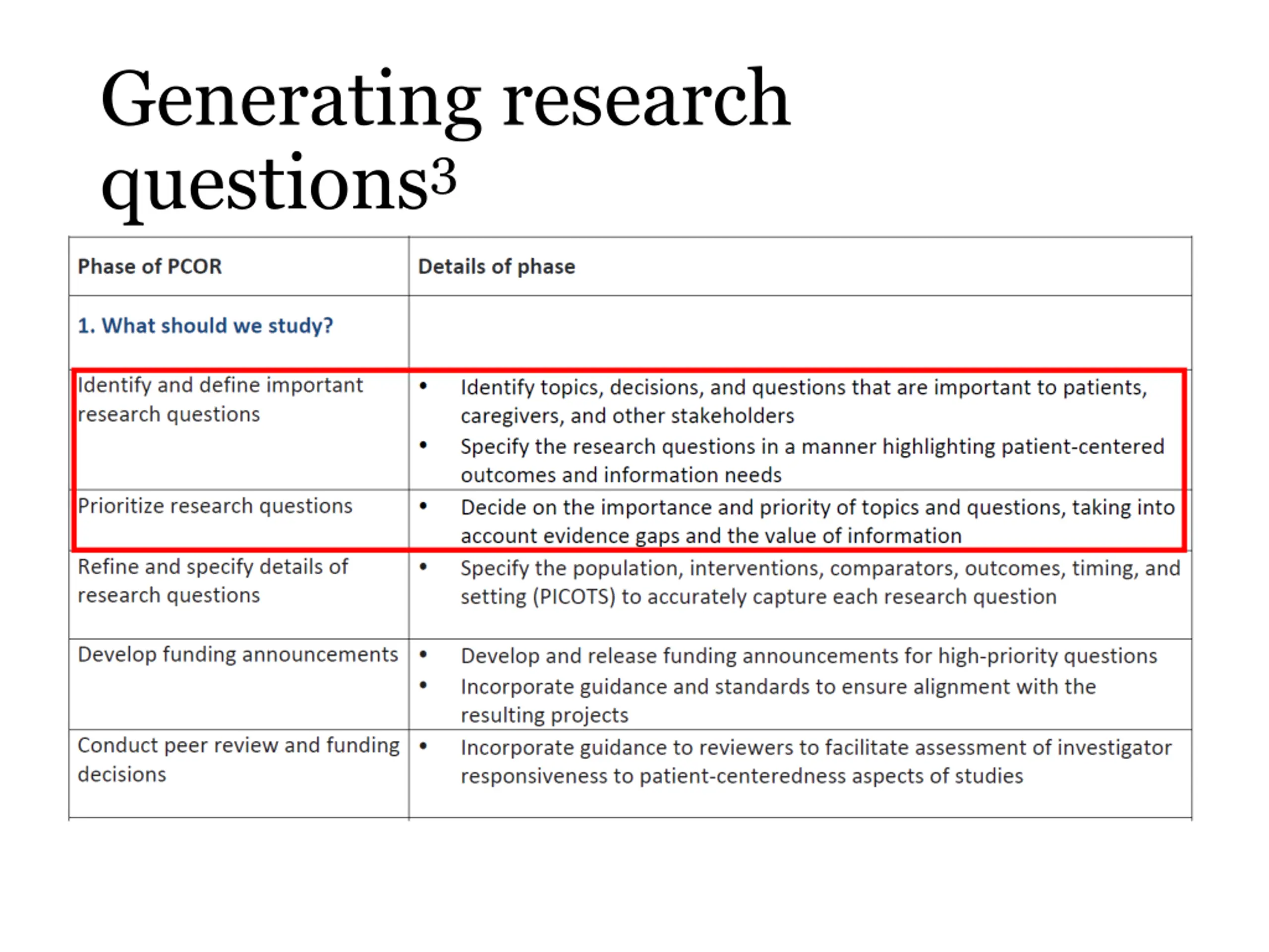 Question development and prioritization A priority problem When it comes to health and healthcare interventions, there are so many important questions! With limited research dollars we need to prioritize We need a set of methods to guide which questions the system should tackle first and a way to keep patients central in that prioritization process Too often this ranking has been done out of public view through a process subject to political and economic forces that lacks a coherent strategy.3 (page 7)