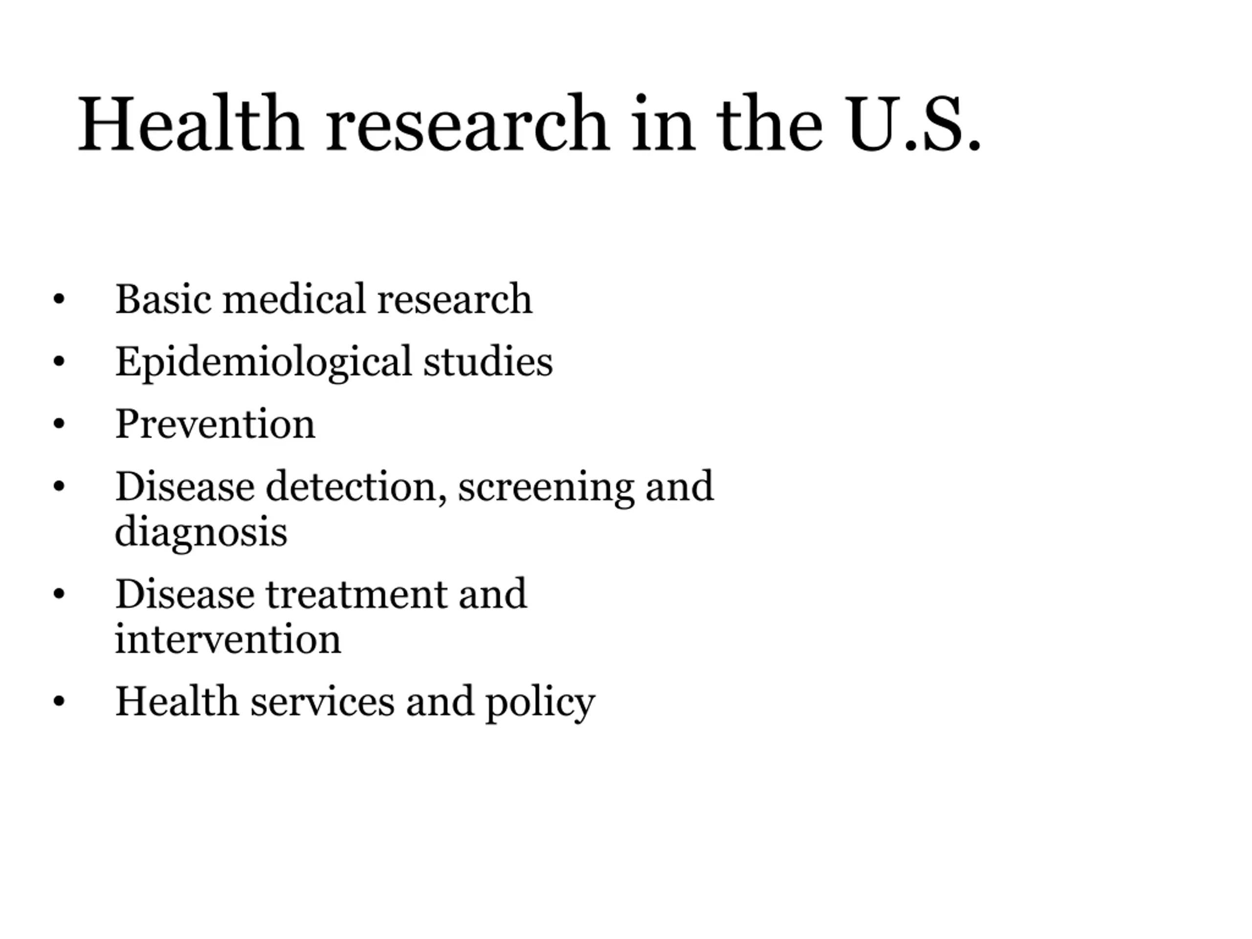 Health research in the U.S. Basic medical research Epidemiological studies Prevention Disease detection, screening and diagnosis Disease treatment and intervention Health services and policy