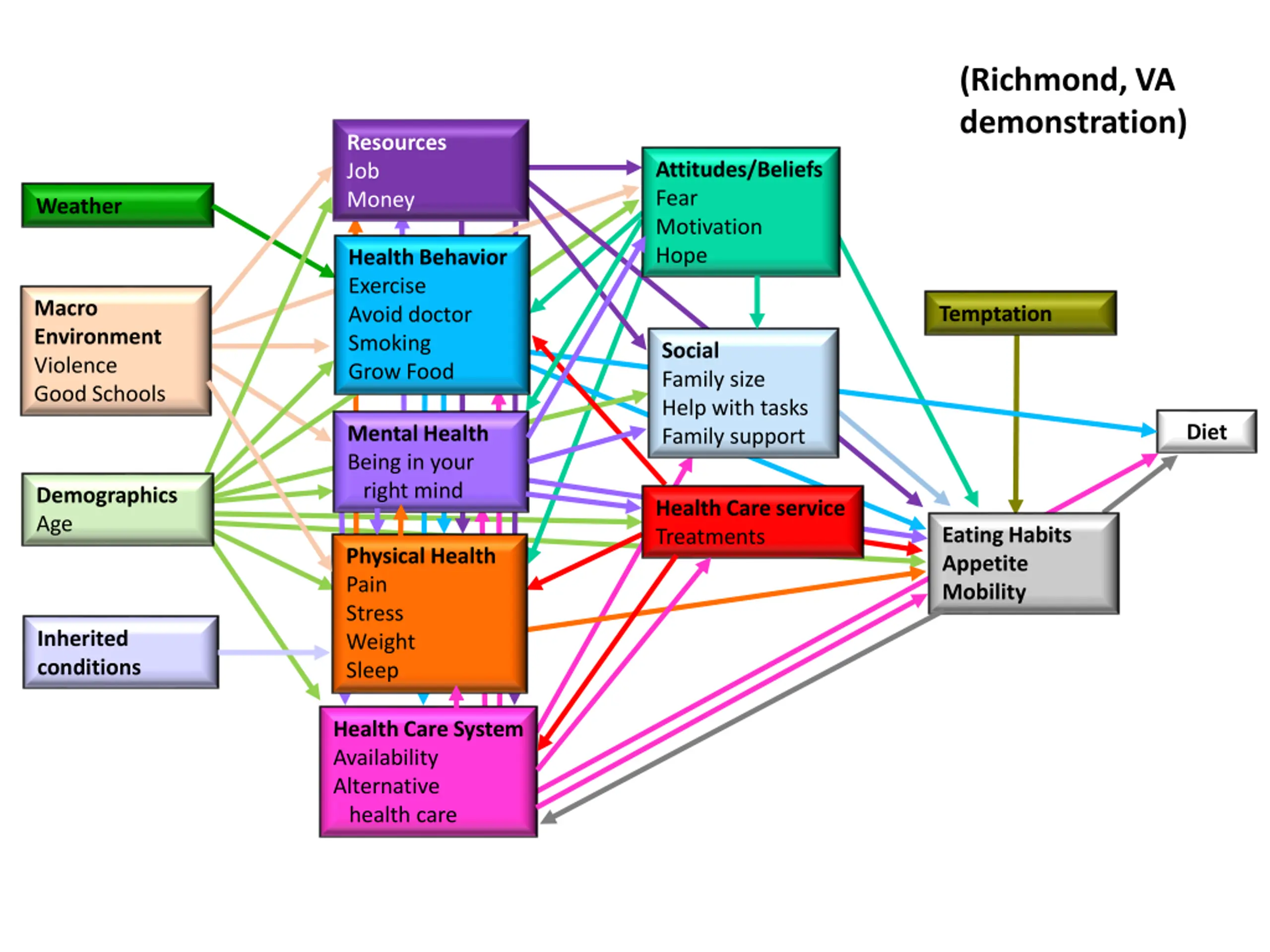 (Richmond, VA demonstration) Resources Job Money Attitudes/Beliefs Fear Motivation Hope Weather Health Behavior Exercise Avoid doctor Smoking Grow Food Macro Environment Violence Good Schools Temptation Social Family size Help with tasks Family support Diet Mental Health Being in your right mind Demographics Age Health Care service Treatments Eating Habits Appetite Mobility Physical Health Pain Stress Weight Sleep Inherited conditions Health Care System Availability Alternative health care
