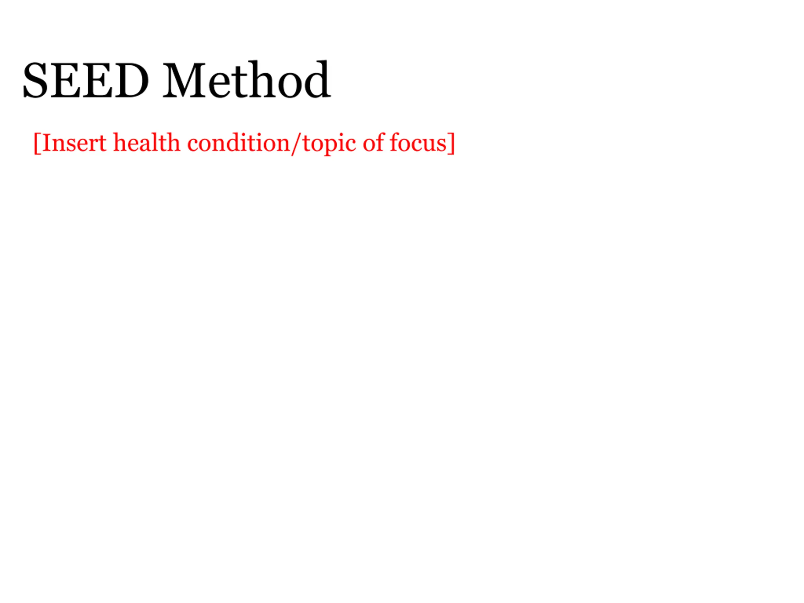 SEED Method: Background The SEED Method was developed in response to PCORI s Improving Methods program Participatory causal modeling as a starting point, then: Focused the process on question development and prioritization Created a number of new steps and participant types Developed instruments and procedures