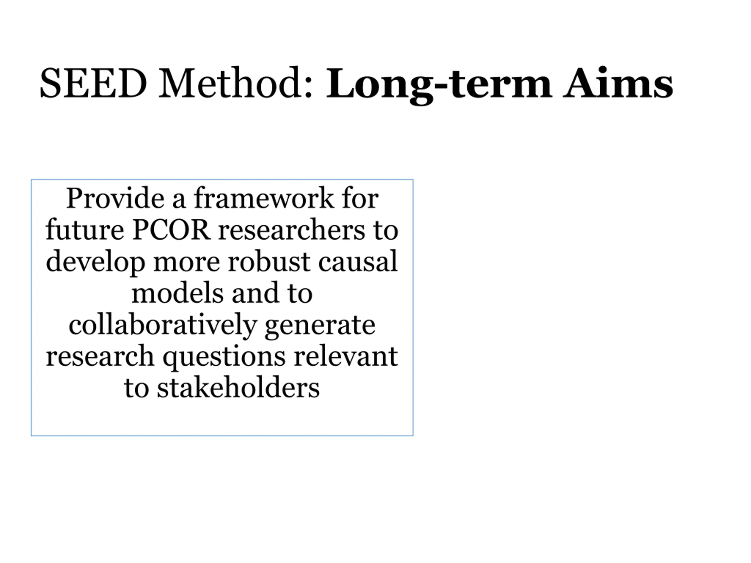 SEED Method: Long-term Aims Provide a framework for future PCOR researchers to develop more robust causal models and to collaboratively generate research questions relevant to stakeholders