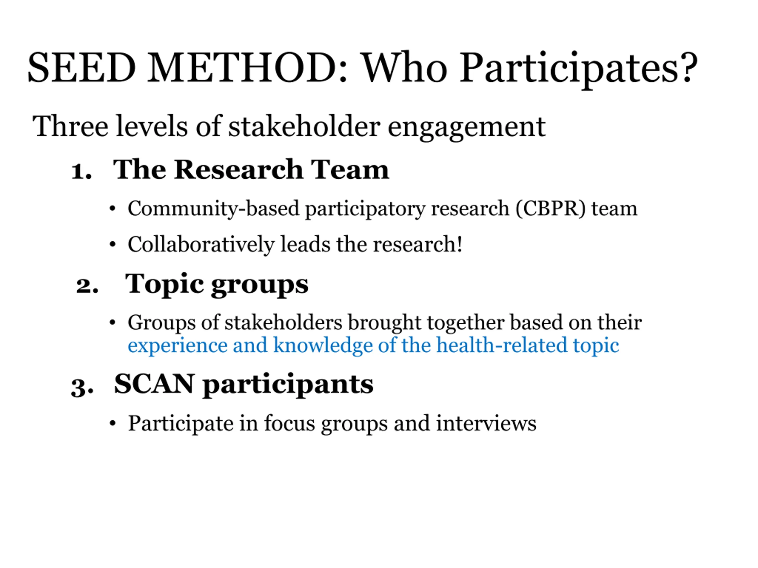 SEED METHOD: Who Participates? Three levels of stakeholder engagement 1. The Research Team Community-based participatory research (CBPR) team Collaboratively leads the research! 2. Topic groups Groups of stakeholders brought together based on their experience and knowledge of the health-related topic 3. SCAN participants Participate in focus groups and interviews