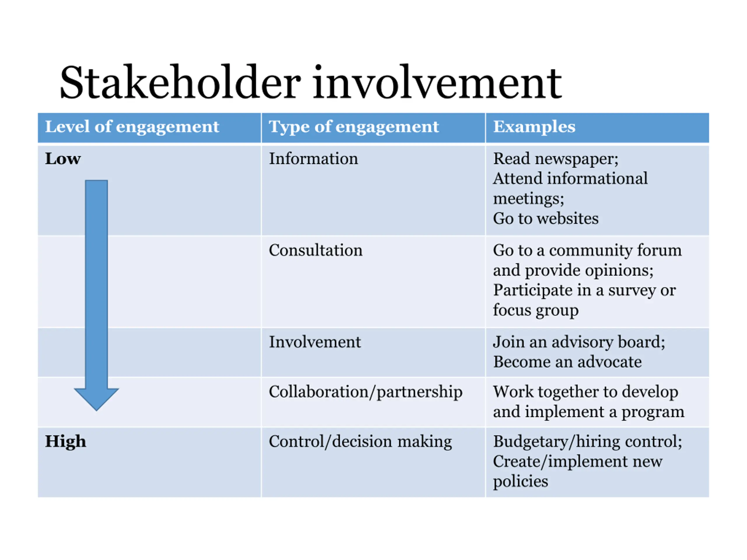 Stakeholder involvement Level of engagement Type of engagement Examples Low Information Read newspaper; Attend informational meetings; Go to websites Consultation Go to a community forum and provide opinions; Participate in a survey or focus group Involvement Join an advisory board; Become an advocate Collaboration/partnership Work together to develop and implement a program High Control/decision making Budgetary/hiring control; Create/implement new policies