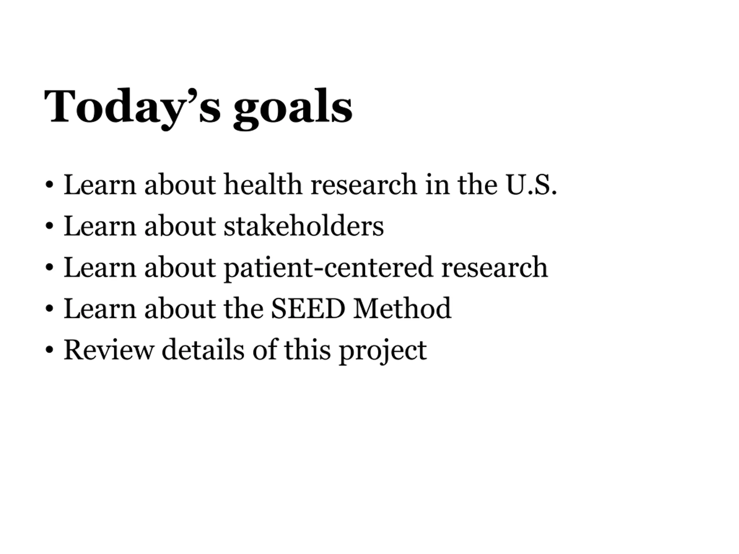 Todays goals Learn about health research in the U.S. Learn about stakeholders Learn about patient-centered research Learn about the SEED Method Review details of this project