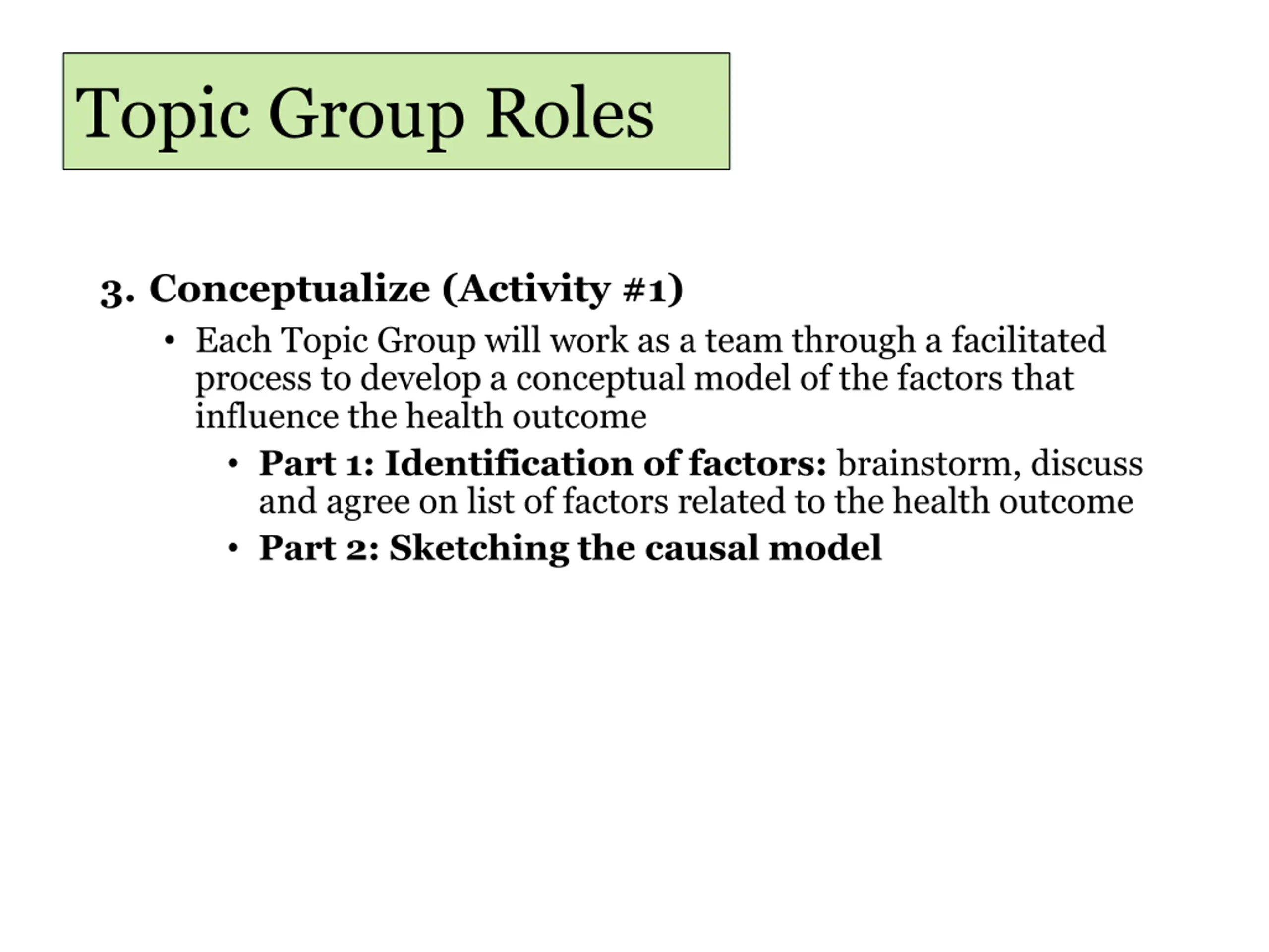 Topic Group Roles 3.Conceptualize (Activity #1) Each Topic Group will work as a team through a facilitated process to develop a conceptual model of the factors that influence the health outcome Part 1: Identification of factors: brainstorm, discuss and agree on list of factors related to the health outcome Part 2: Sketching the causal model