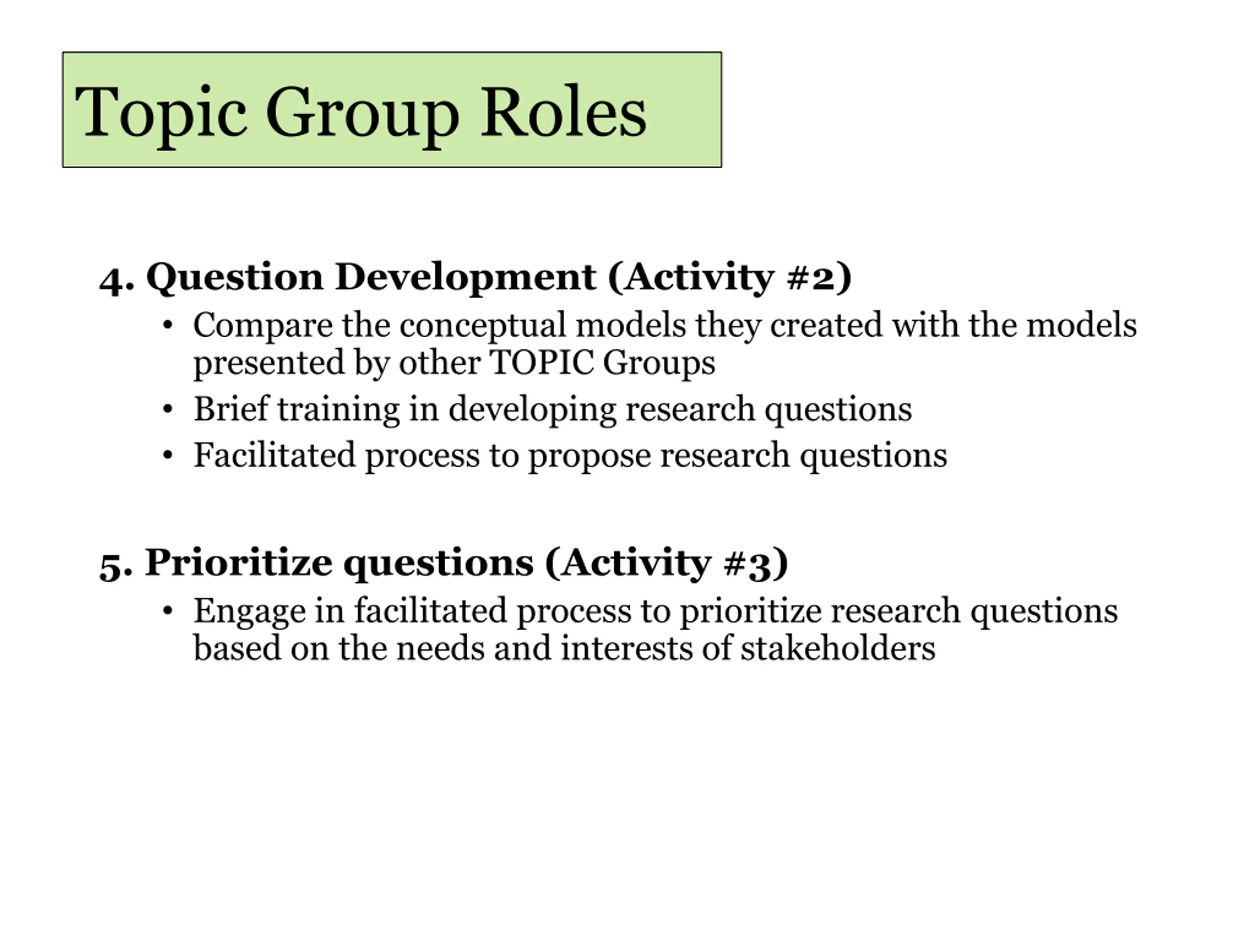 Topic Group Roles 4. Question Development (Activity #2) Compare the conceptual models they created with the models presented by other TOPIC Groups Brief training in developing research questions Facilitated process to propose research questions 5. Prioritize questions (Activity #3) Engage in facilitated process to prioritize research questions based on the needs and interests of stakeholders