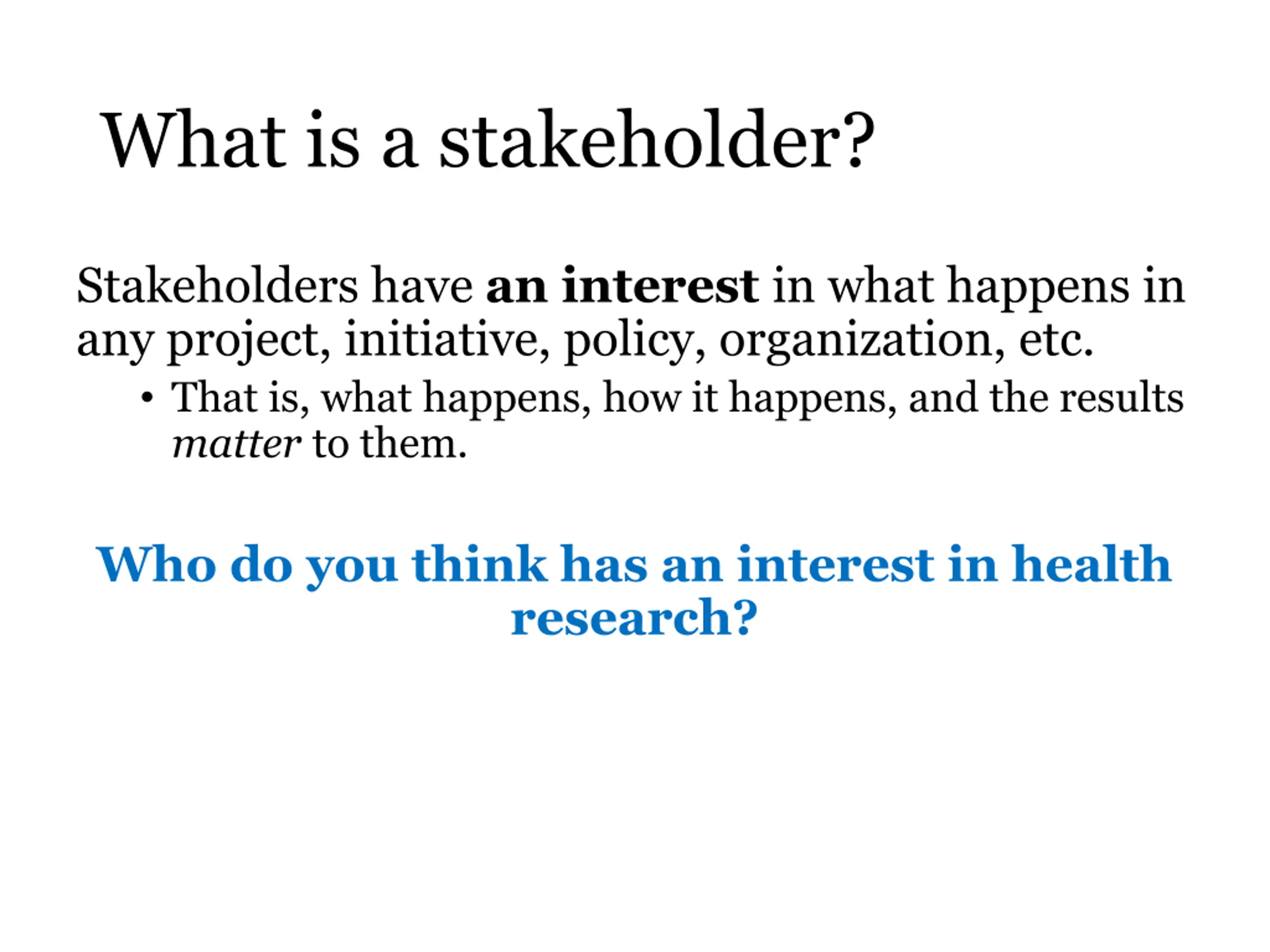 What is a stakeholder? Stakeholders have an interest in what happens in any project, initiative, policy, organization, etc. That is, what happens, how it happens, and the results matter to them. Who do you think has an interest in health research?