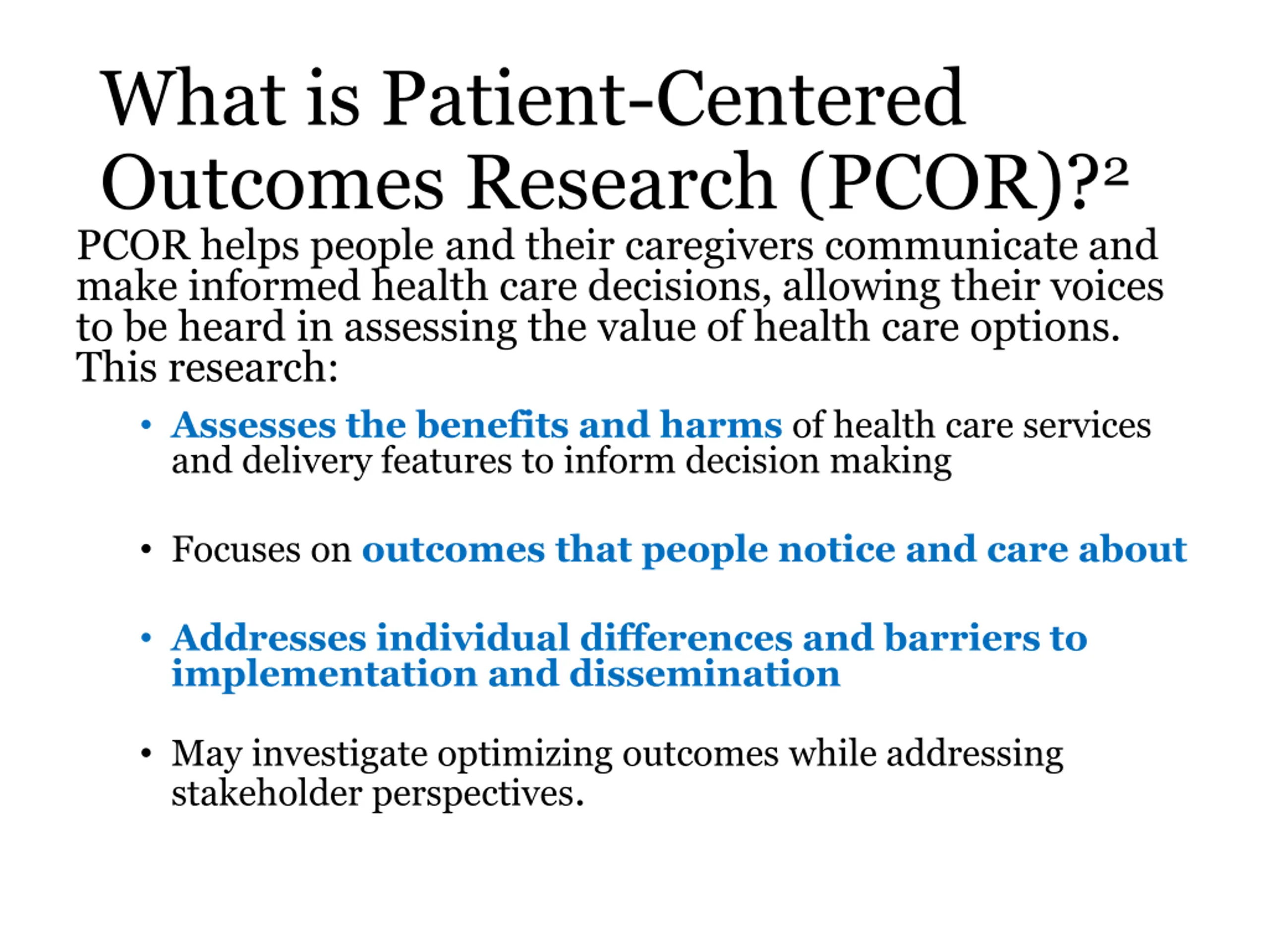 What is Patient-Centered Outcomes Research (PCOR)?2 PCOR helps people and their caregivers communicate and make informed health care decisions, allowing their voices to be heard in assessing the value of health care options. This research: Assesses the benefits and harms of health care services and delivery features to inform decision making Focuses on outcomes that people notice and care about Addresses individual differences and barriers to implementation and dissemination May investigate optimizing outcomes while addressing stakeholder perspectives.
