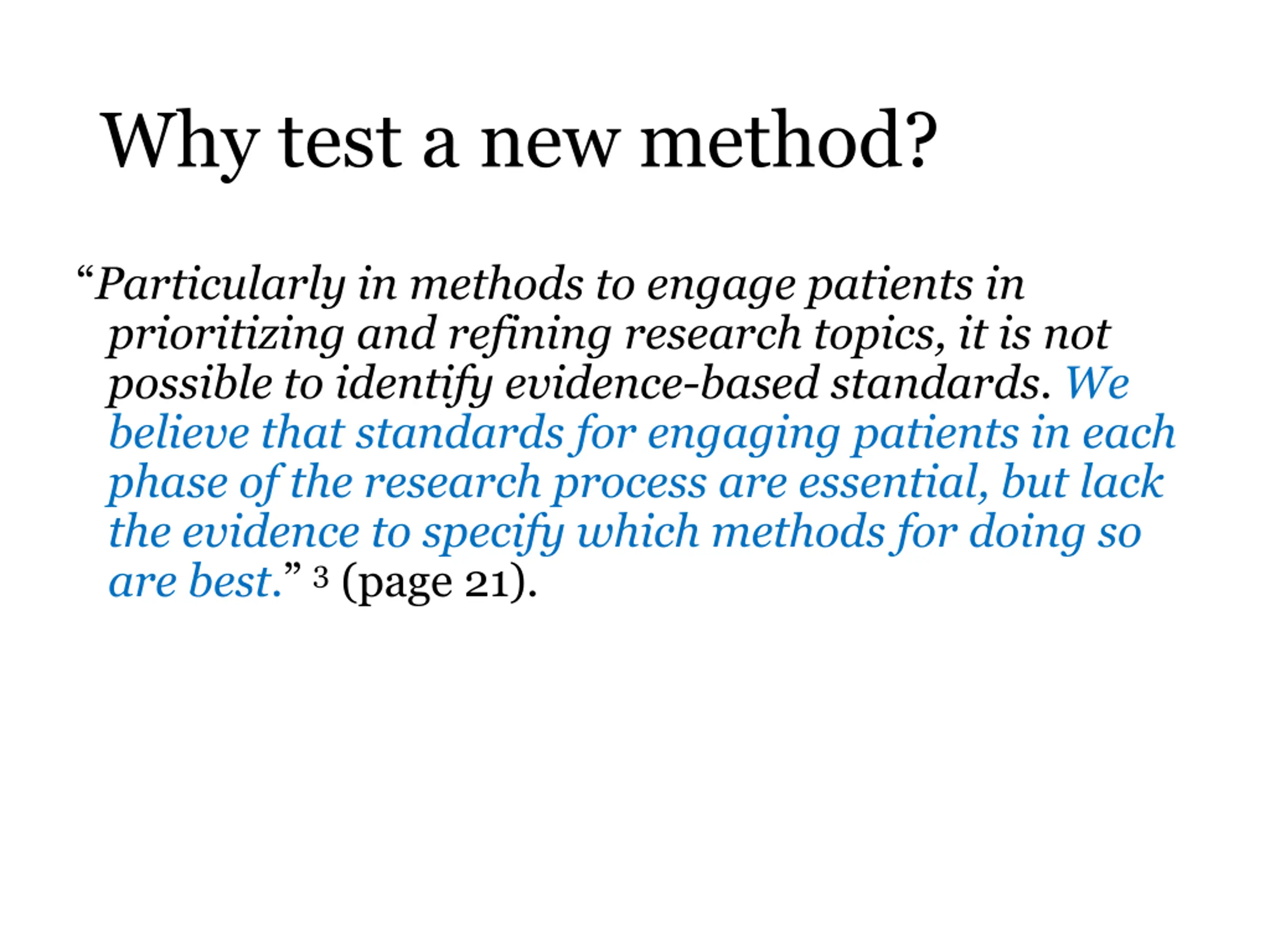 Why test a new method? Particularly in methods to engage patients in prioritizing and refining research topics, it is not possible to identify evidence-based standards. We believe that standards for engaging patients in each phase of the research process are essential, but lack the evidence to specify which methods for doing so are best. 3 (page 21).