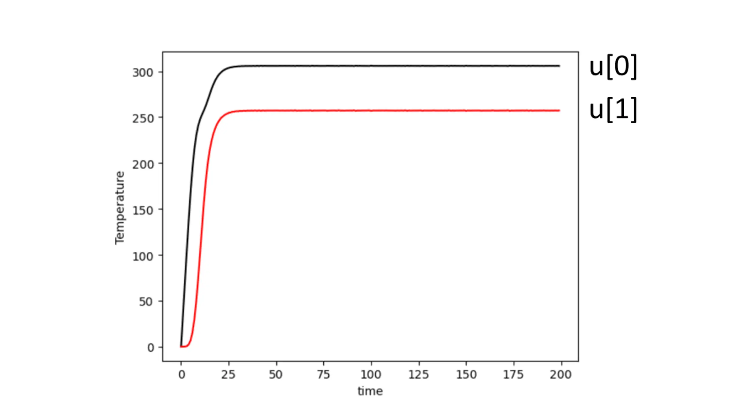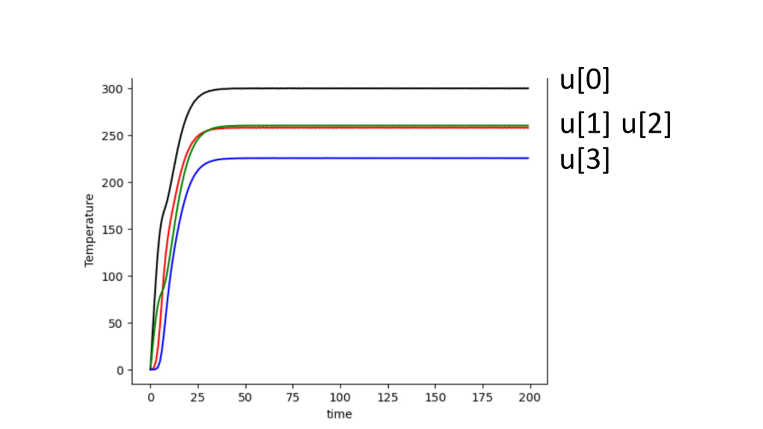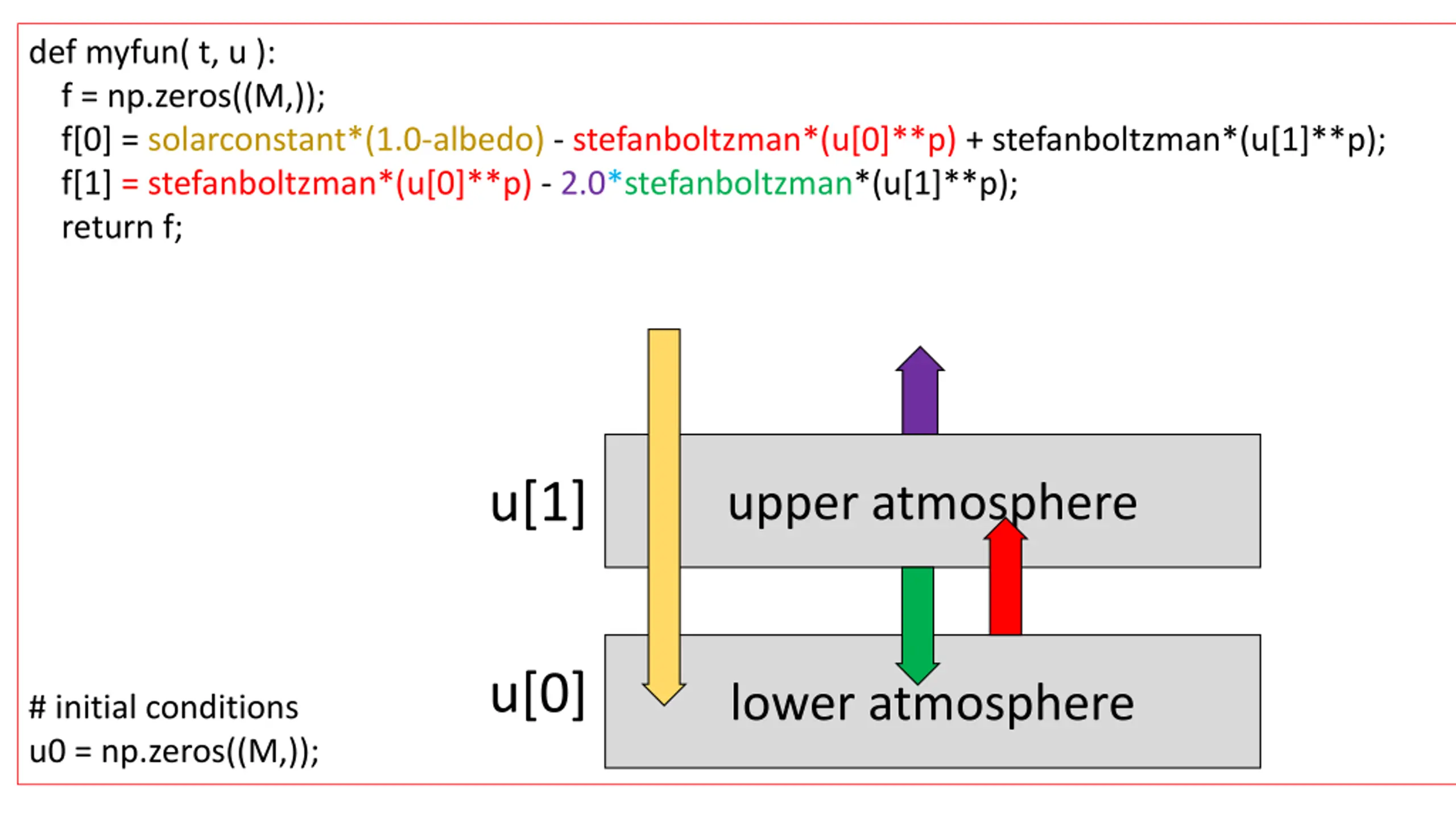 def myfun( t, u ): f = np.zeros((M,)); f[0] = solarconstant*(1.0-albedo) - stefanboltzman*(u[0]**p) + stefanboltzman*(u[1]**p); f[1] = stefanboltzman*(u[0]**p) - 2.0*stefanboltzman*(u[1]**p); return f; u[1] upper atmosphere u[0] lower atmosphere # initial conditions u0 = np.zeros((M,));