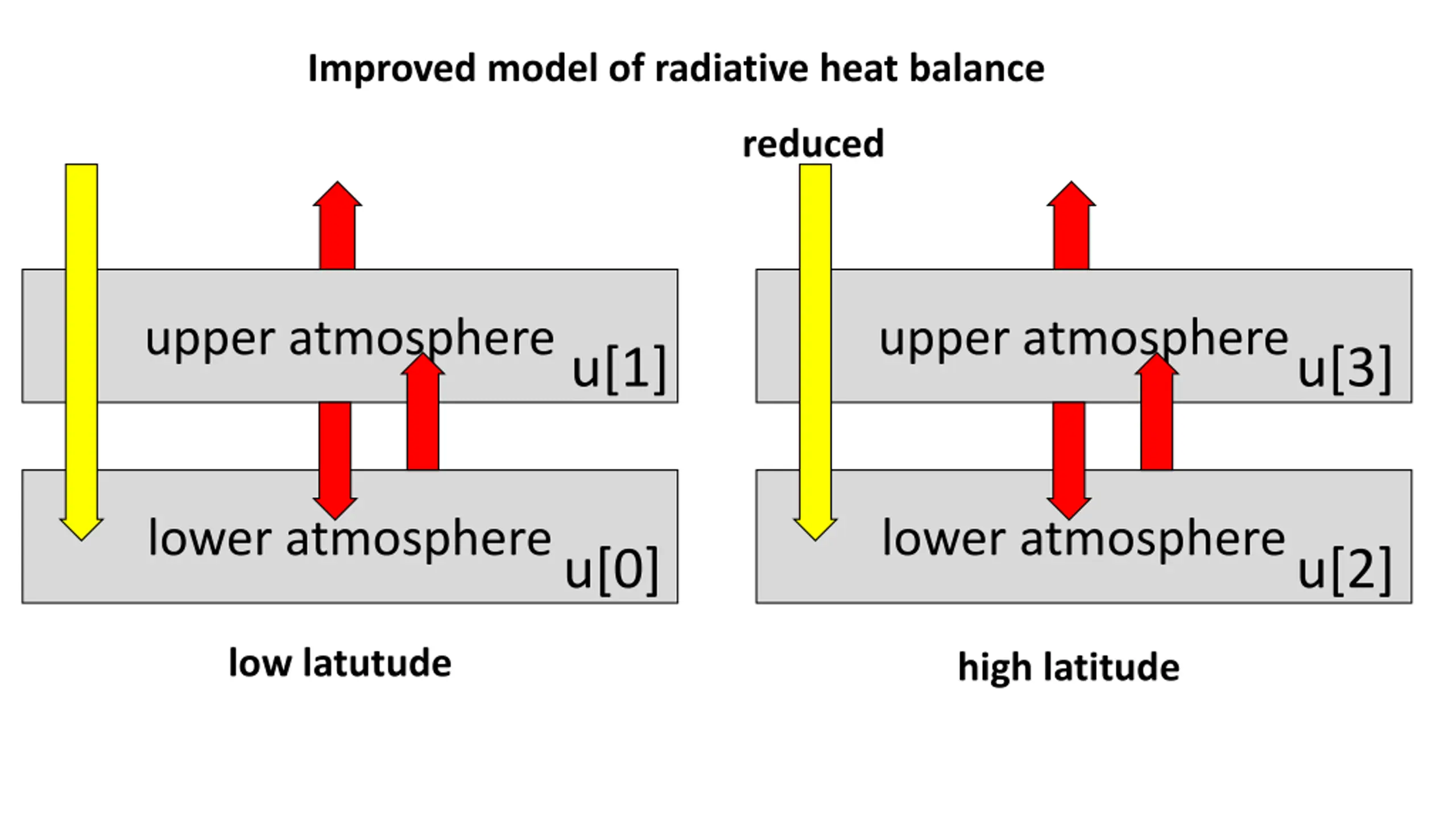 Improved model of radiative heat balance reduced upper atmosphere upper atmosphere u[1] u[3] lower atmosphere lower atmosphere u[0] u[2] low latutude high latitude