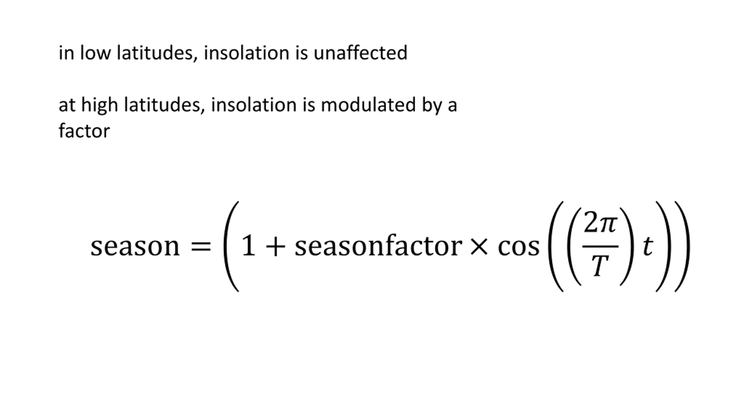 in low latitudes, insolation is unaffected at high latitudes, insolation is modulated by a factor 2? ? season = 1 + seasonfactor cos ?