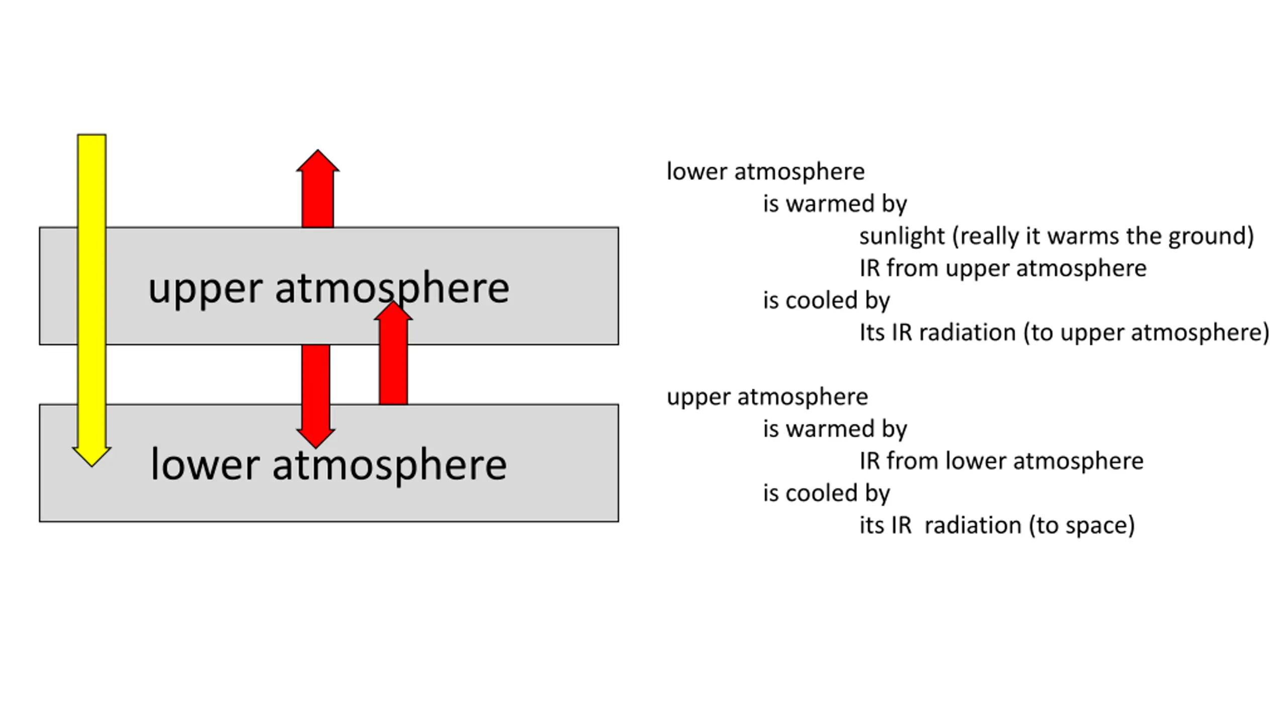 lower atmosphere is warmed by is cooled by sunlight (really it warms the ground) IR from upper atmosphere upper atmosphere Its IR radiation (to upper atmosphere) upper atmosphere is warmed by is cooled by lower atmosphere IR from lower atmosphere its IR radiation (to space)