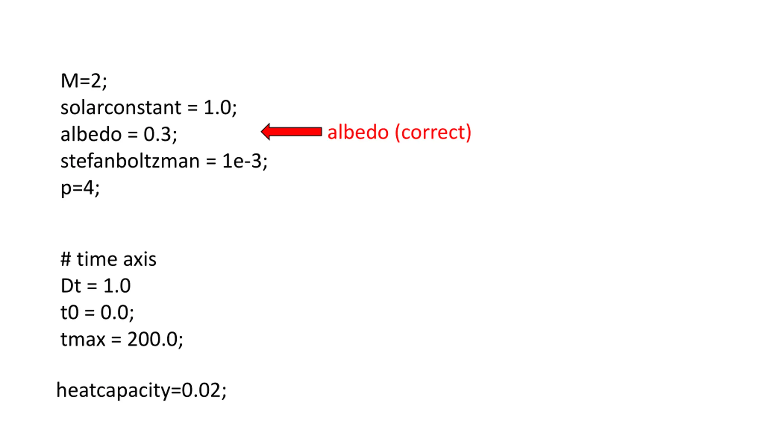 M=2; solarconstant = 1.0; albedo = 0.3; stefanboltzman = 1e-3; p=4; albedo (correct) # time axis Dt = 1.0 t0 = 0.0; tmax = 200.0; heatcapacity=0.02;