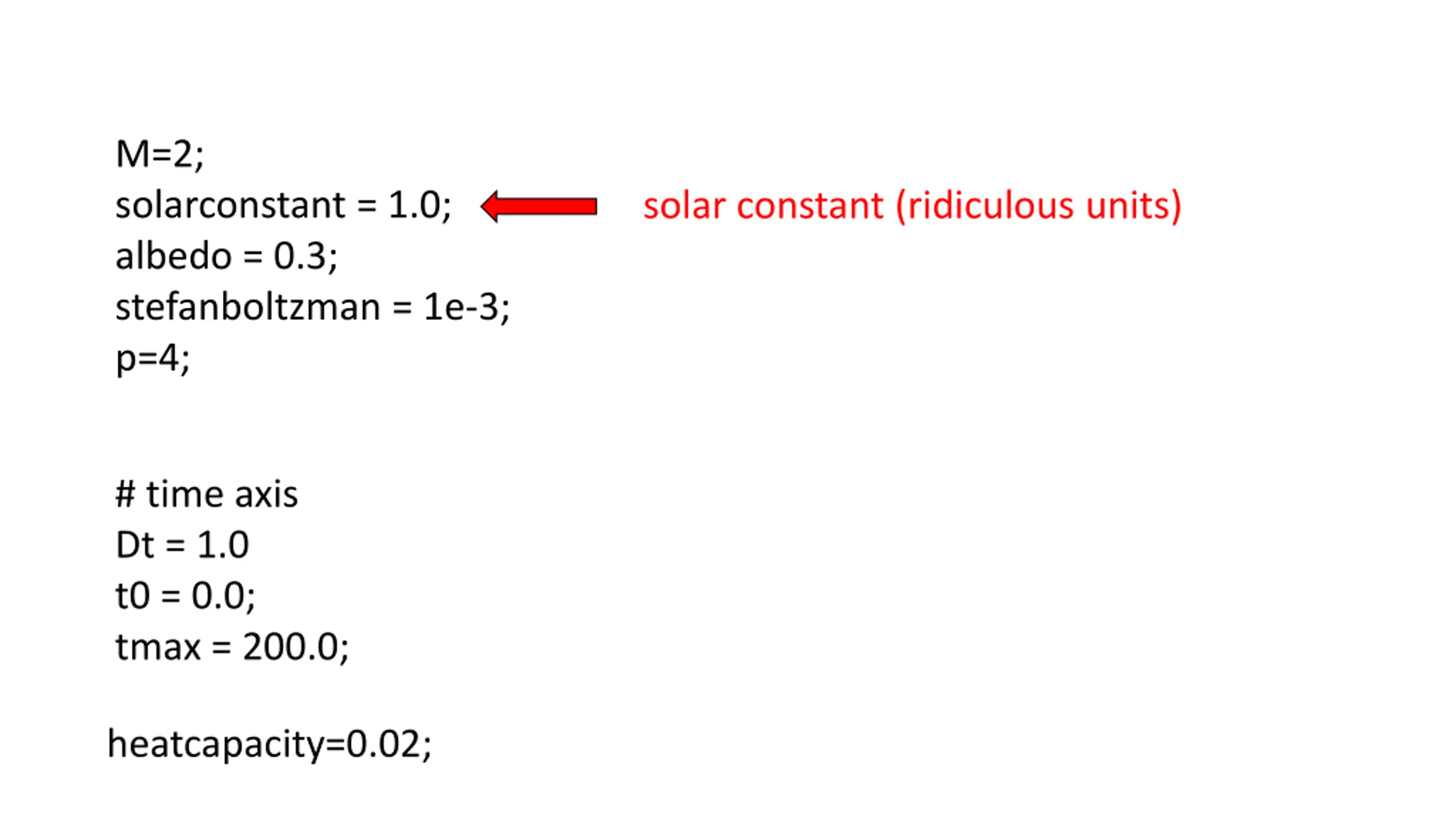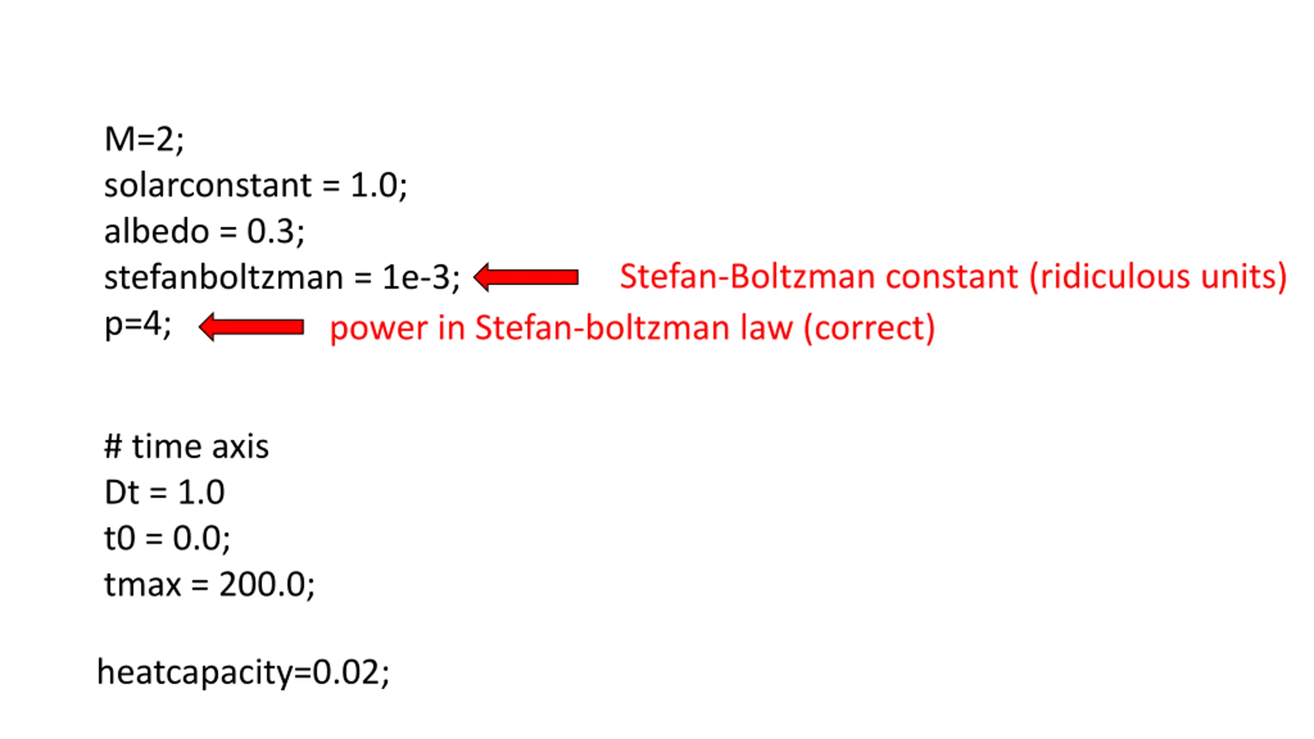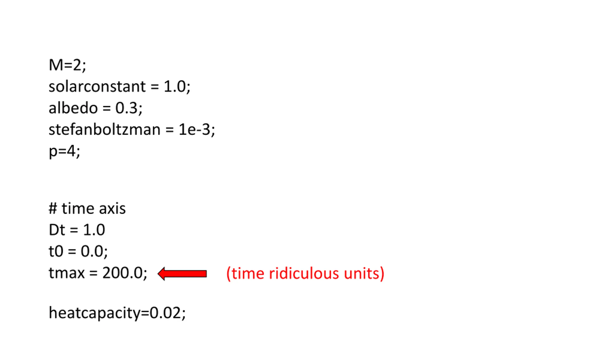 M=2; solarconstant = 1.0; albedo = 0.3; stefanboltzman = 1e-3; p=4; solar constant (ridiculous units) # time axis Dt = 1.0 t0 = 0.0; tmax = 200.0; heatcapacity=0.02;