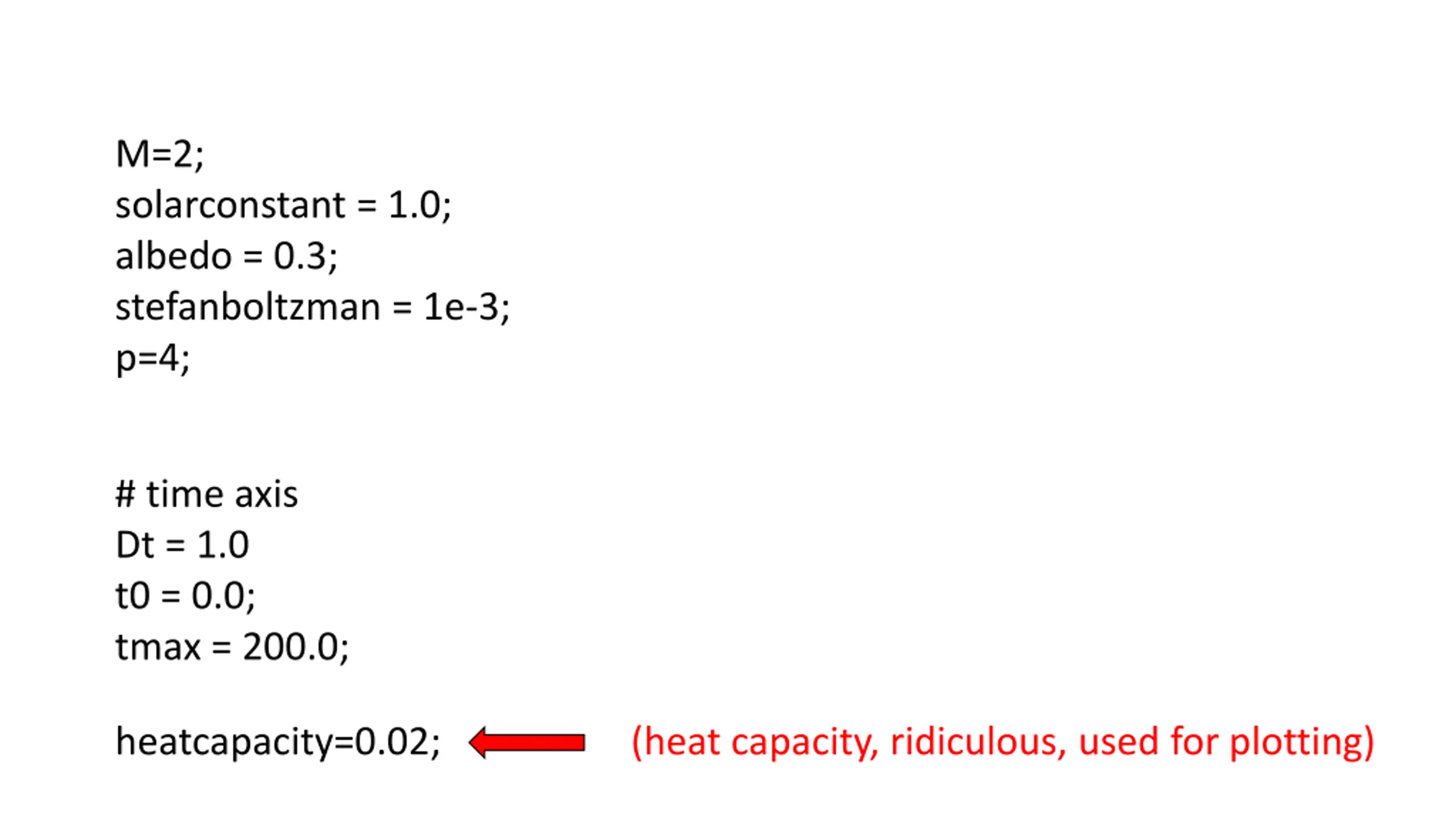 M=2; solarconstant = 1.0; albedo = 0.3; stefanboltzman = 1e-3; p=4; # time axis Dt = 1.0 t0 = 0.0; tmax = 200.0; heatcapacity=0.02; (heat capacity, ridiculous, used for plotting)