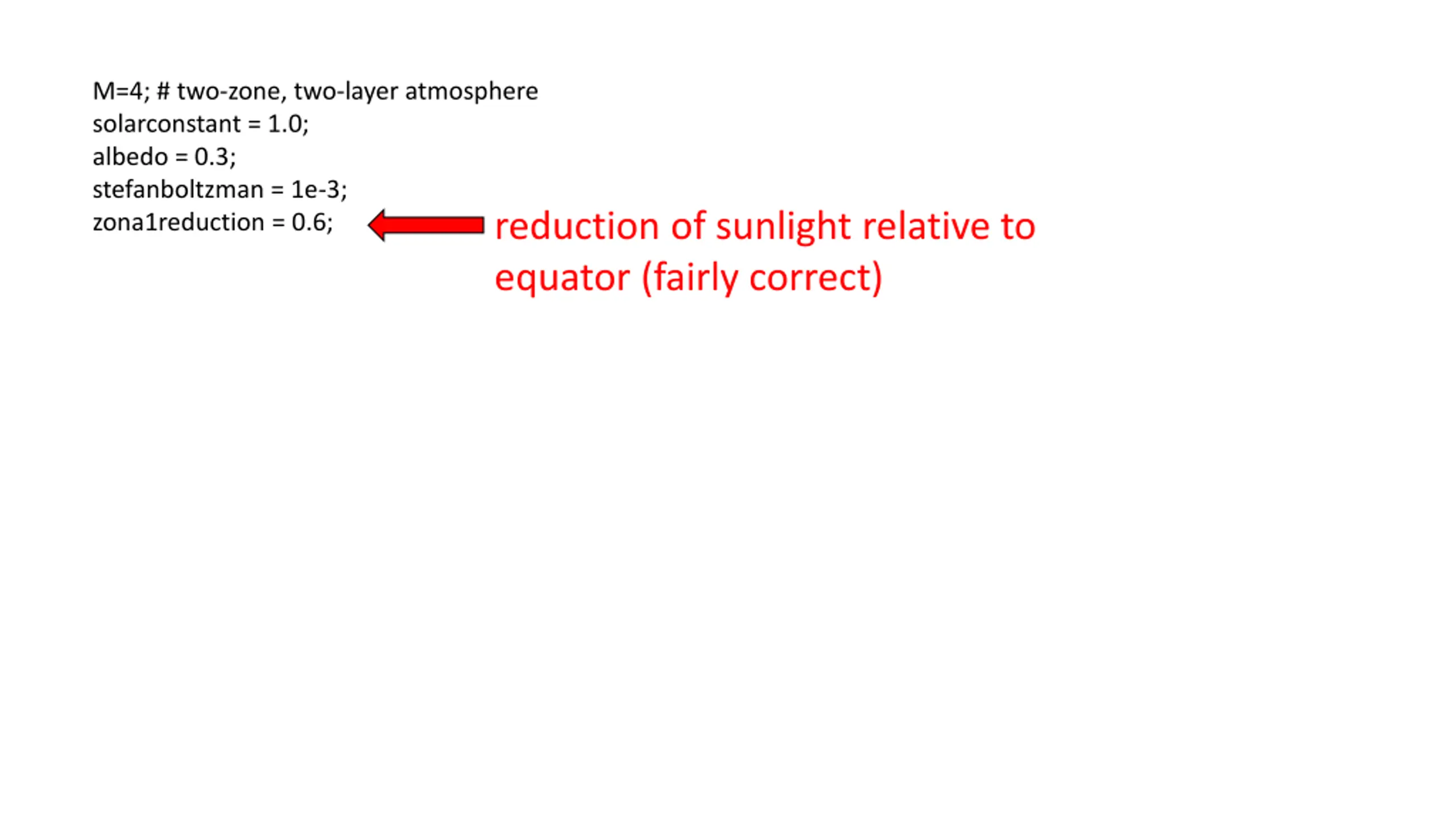 M=4; # two-zone, two-layer atmosphere solarconstant = 1.0; albedo = 0.3; stefanboltzman = 1e-3; zona1reduction = 0.6; reduction of sunlight relative to equator (fairly correct)