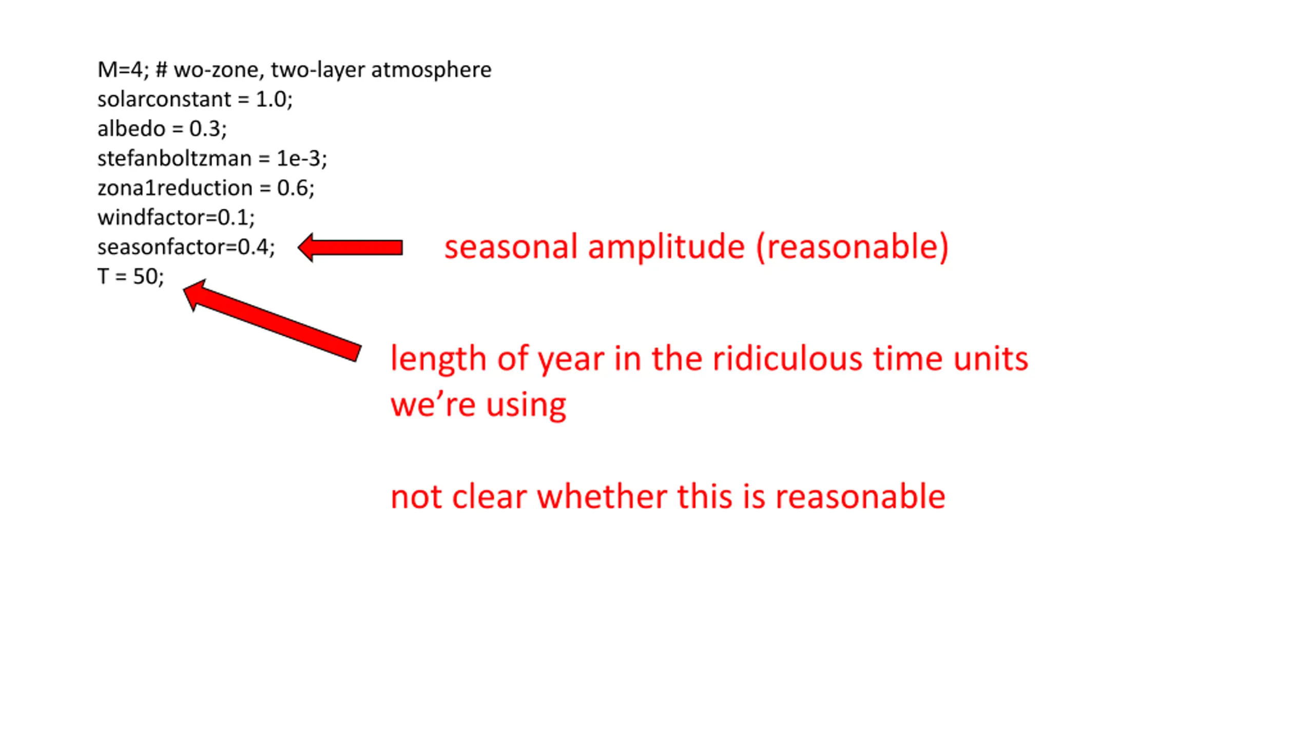 M=4; # wo-zone, two-layer atmosphere solarconstant = 1.0; albedo = 0.3; stefanboltzman = 1e-3; zona1reduction = 0.6; windfactor=0.1; seasonfactor=0.4; T = 50; seasonal amplitude (reasonable) length of year in the ridiculous time units we re using not clear whether this is reasonable