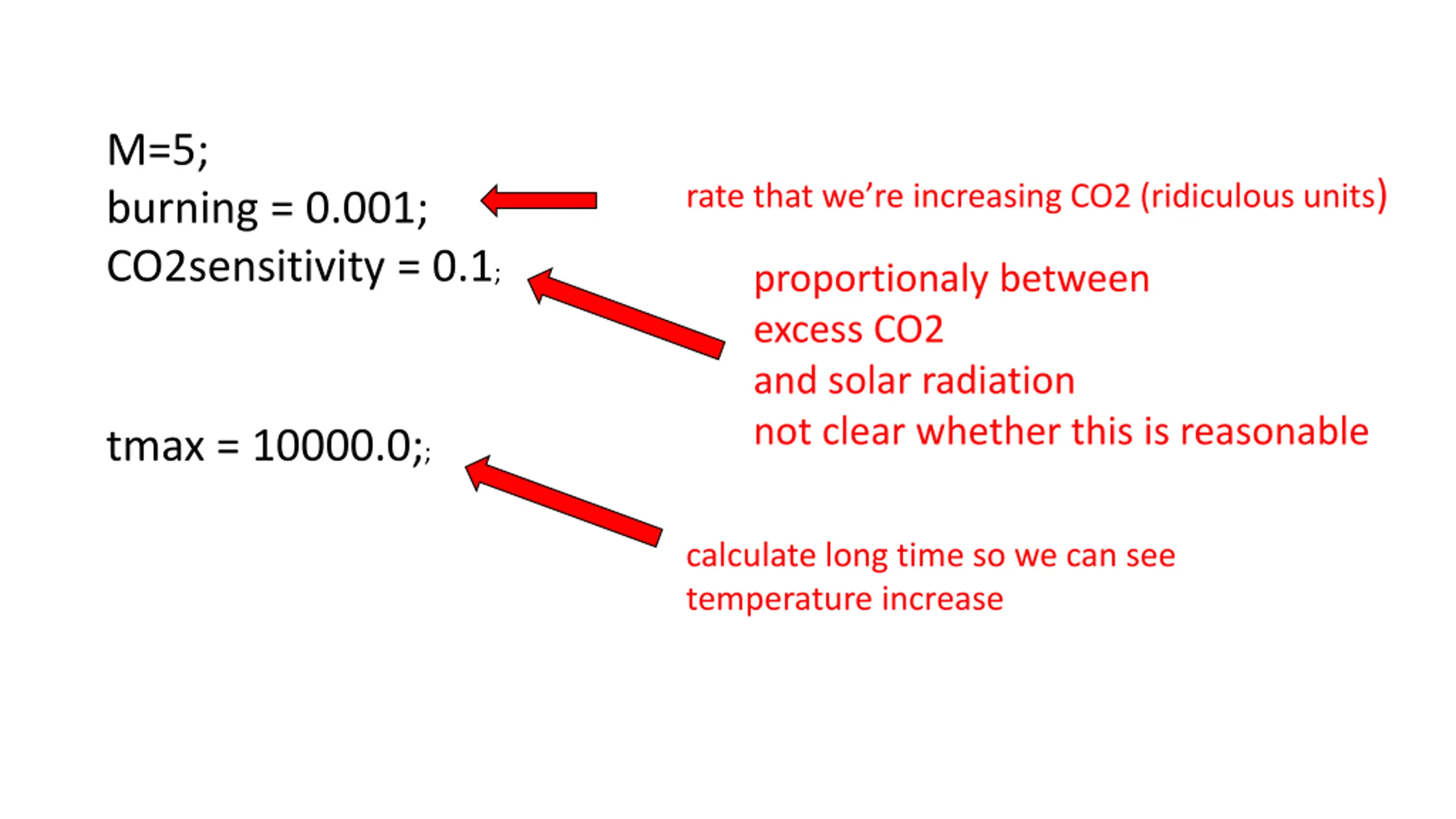 M=5; burning = 0.001; CO2sensitivity = 0.1; rate that we re increasing CO2 (ridiculous units) proportionaly between excess CO2 and solar radiation not clear whether this is reasonable tmax = 10000.0;; calculate long time so we can see temperature increase