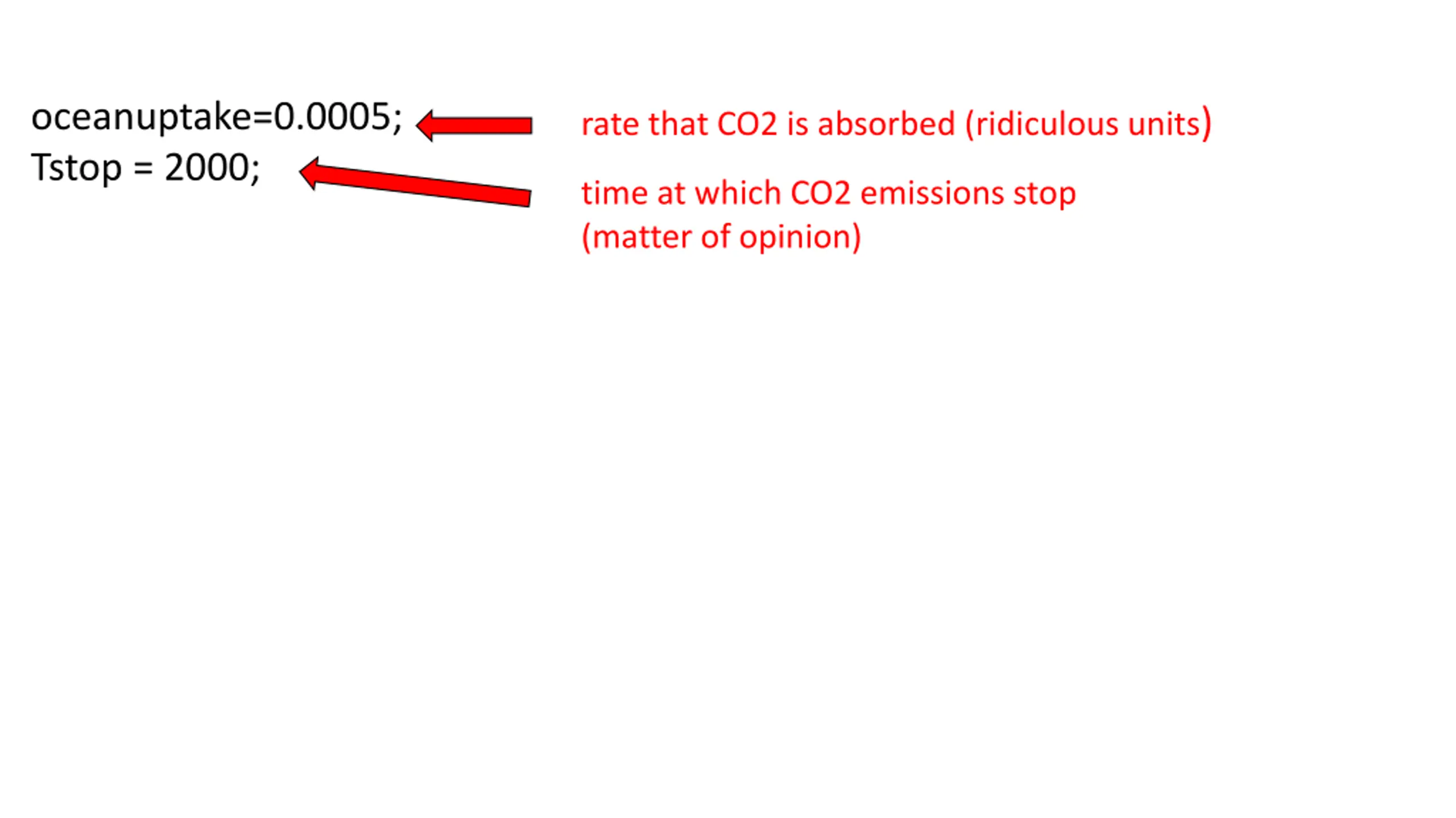 oceanuptake=0.0005; Tstop = 2000; rate that CO2 is absorbed (ridiculous units) time at which CO2 emissions stop (matter of opinion)