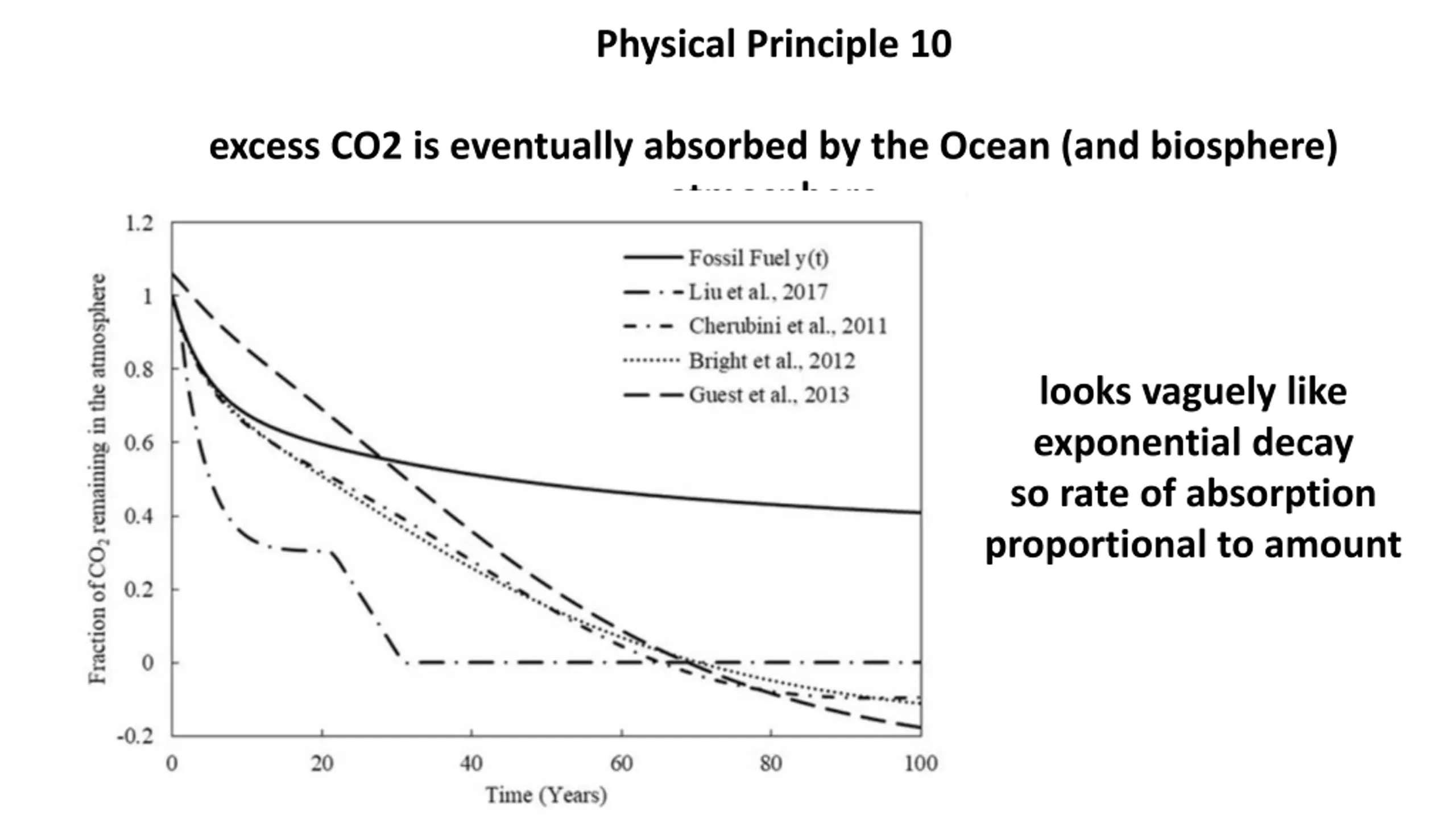 Physical Principle 10 excess CO2 is eventually absorbed by the Ocean (and biosphere) atmosphere looks vaguely like exponential decay so rate of absorption proportional to amount