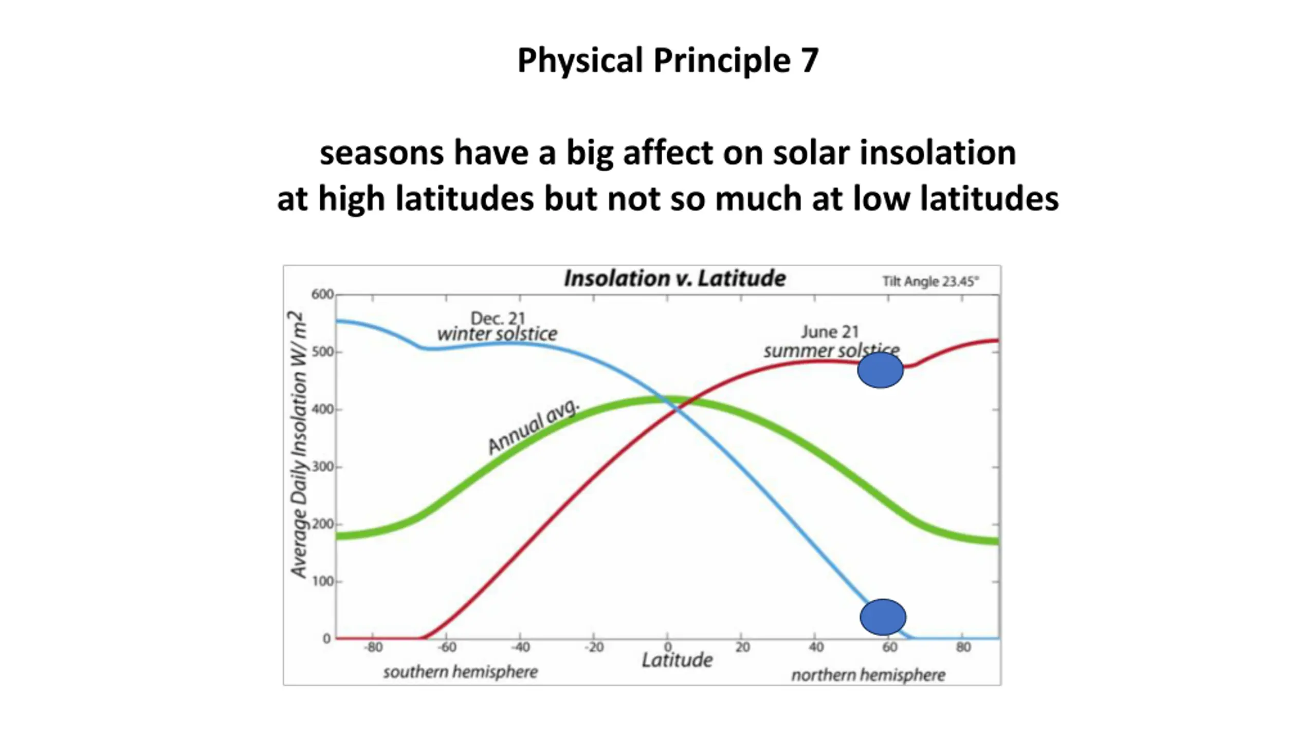 Physical Principle 7 seasons have a big affect on solar insolation at high latitudes but not so much at low latitudes